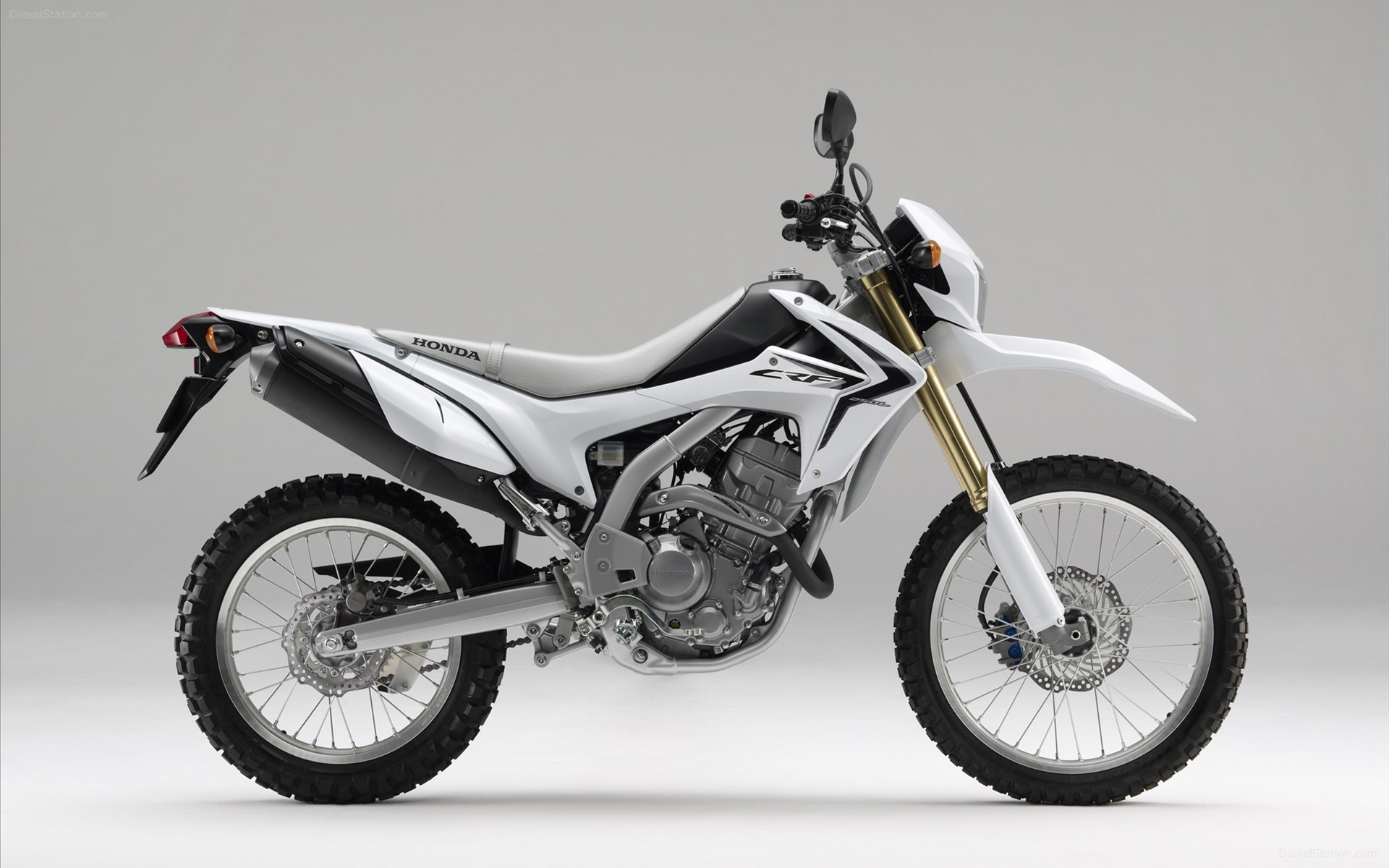 Description: A white motorcycle parked on top of a white floor next to a wall and a gray wall behind it.