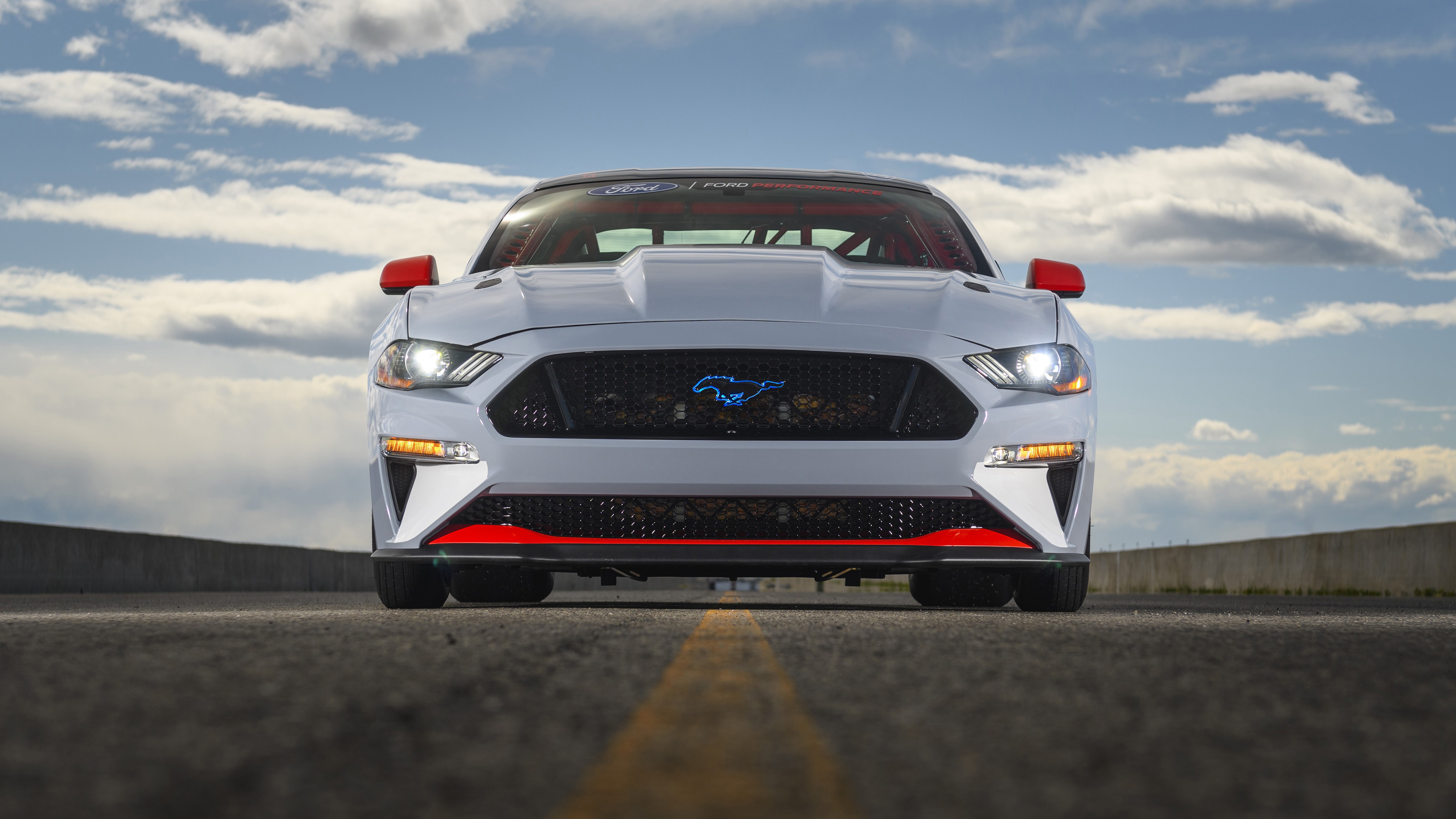 Description: A white mustang mustang car driving down a road under a cloudy sky with clouds in the background and a yellow line.