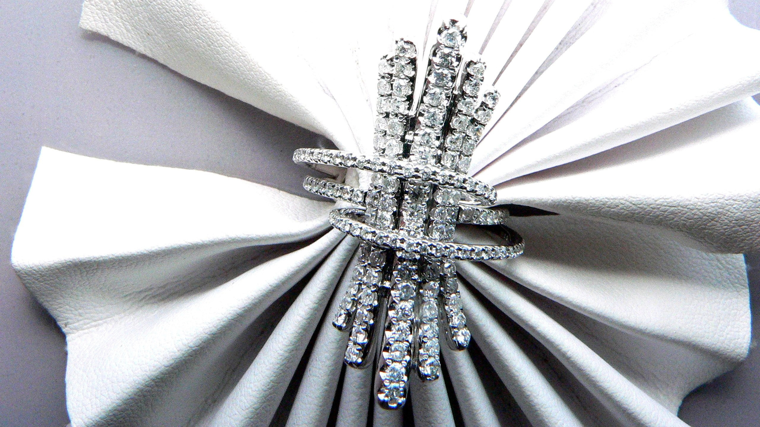 Description: A white napkin with a bow and a diamond brooch on it.