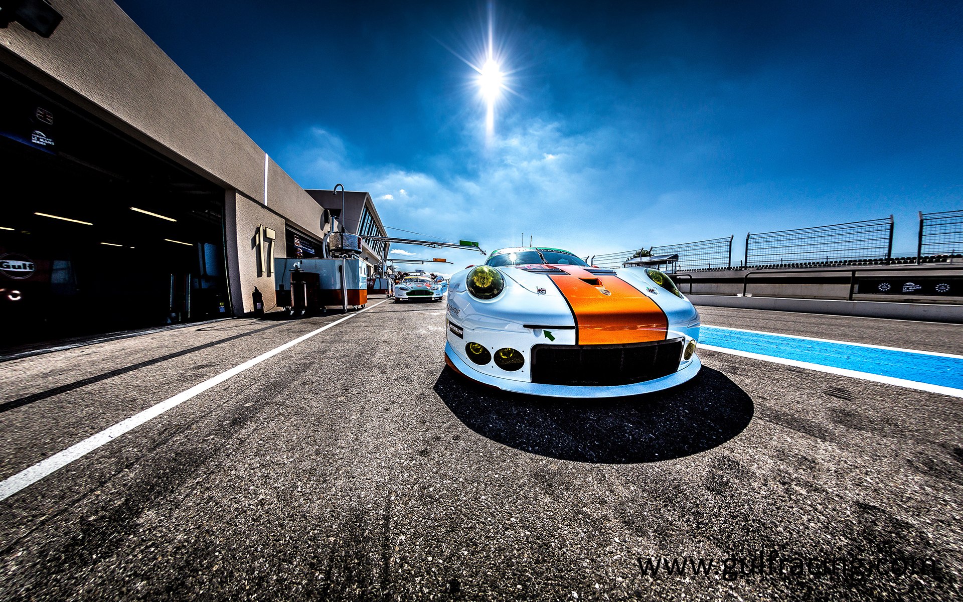 Description: A white and orange sports car parked in a parking lot next to a building and a parking garage with a blue sky.