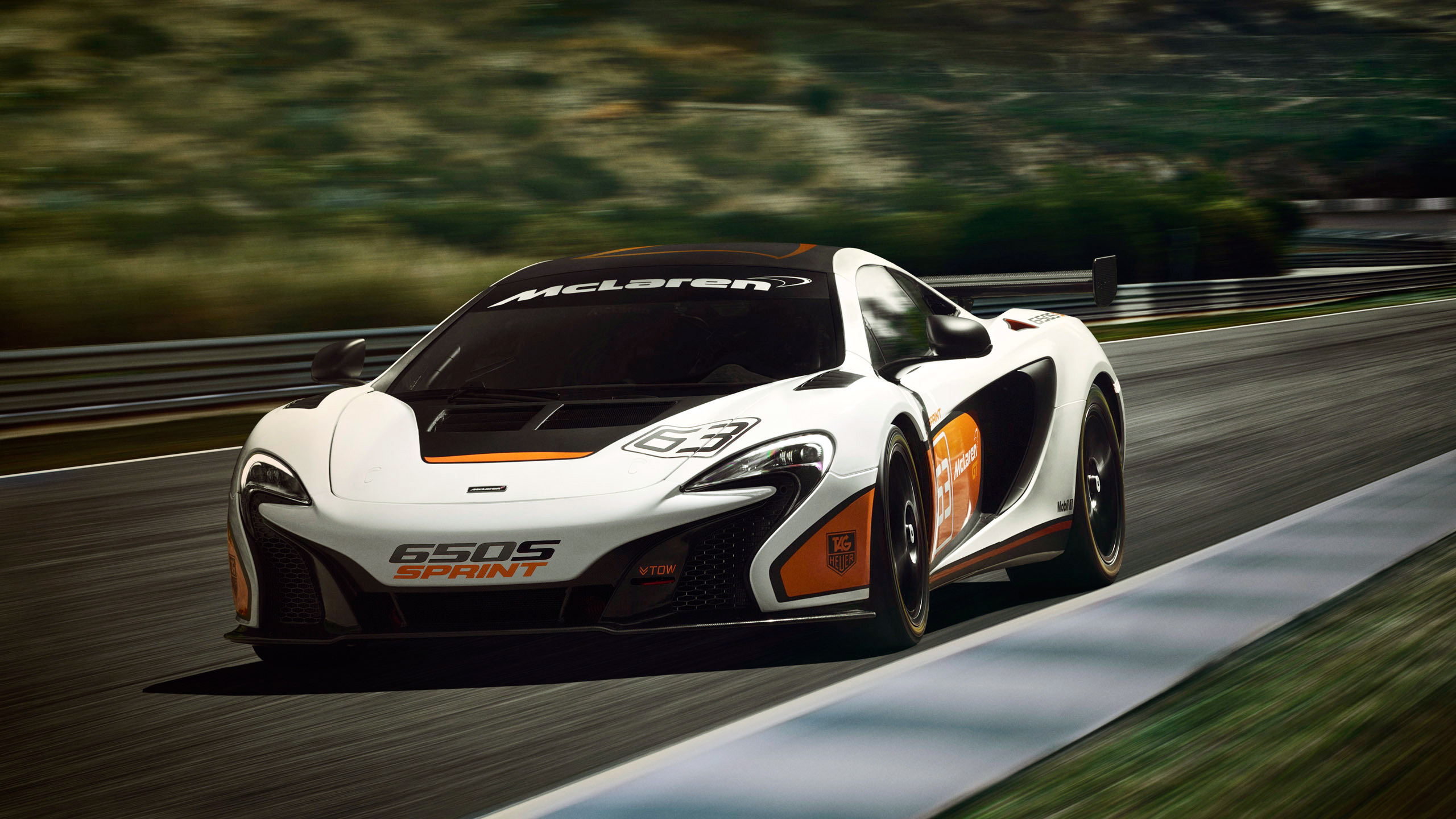 Description: A white and orange sports car driving down a race track with trees in the background and a hill in the distance.