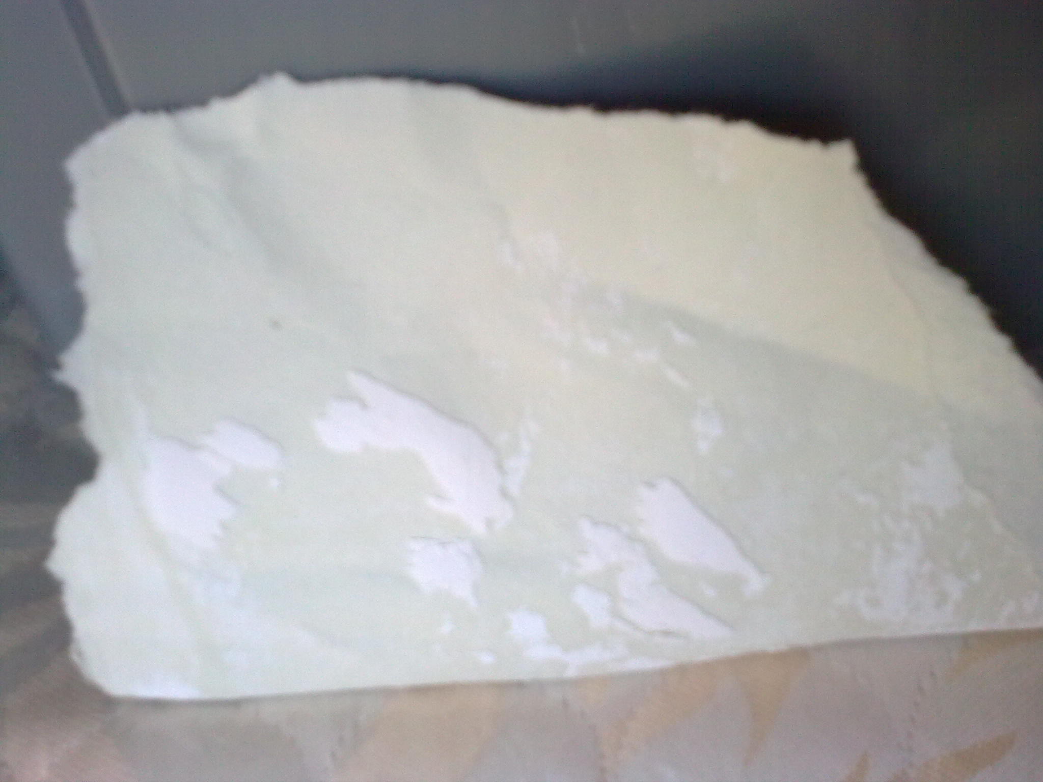 Description: A piece of white paper sitting on top of a table next to a wall with a cat on it.