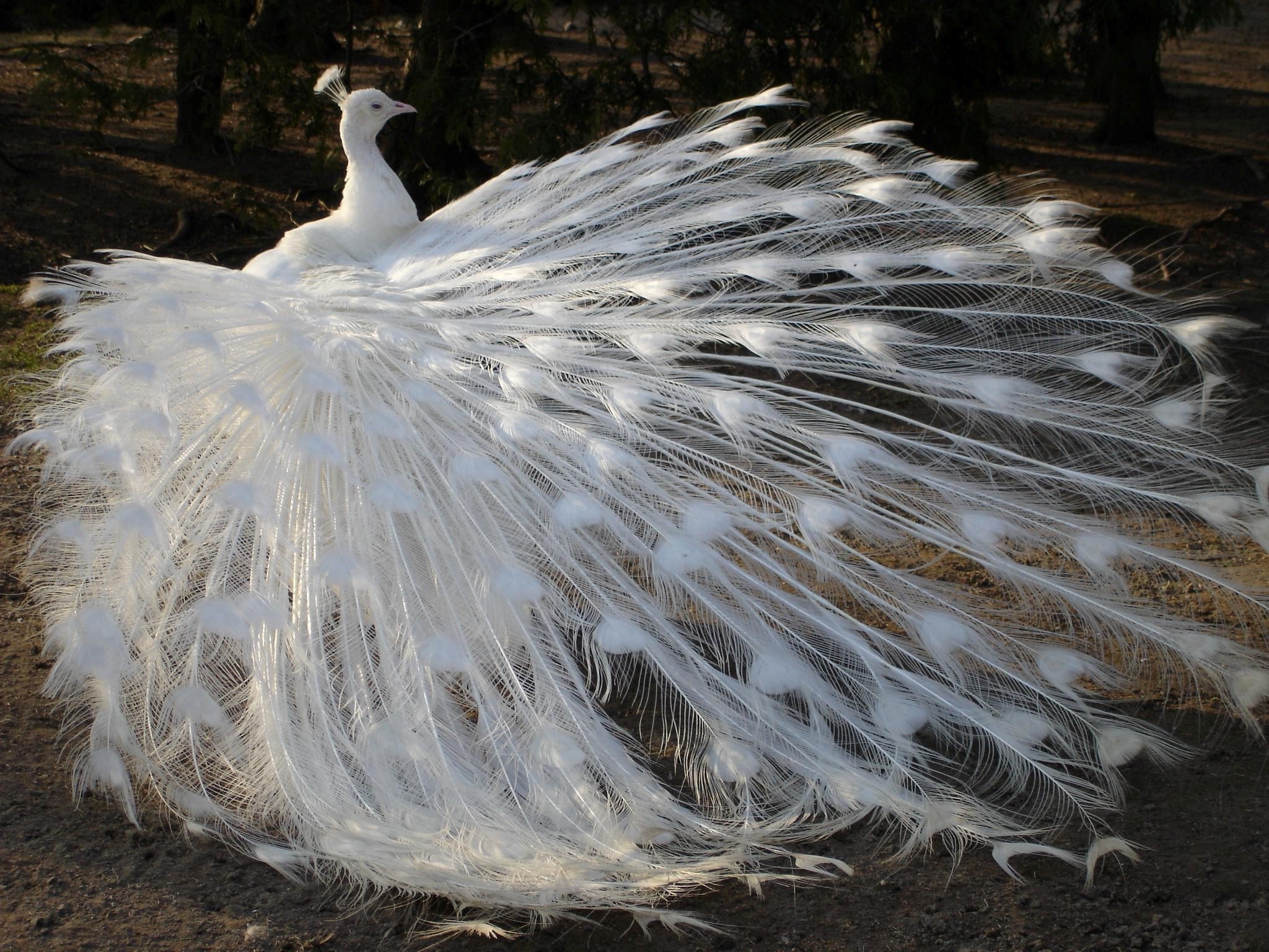 Description: A white peacock with feathers spread out on the ground in front of trees and grass.