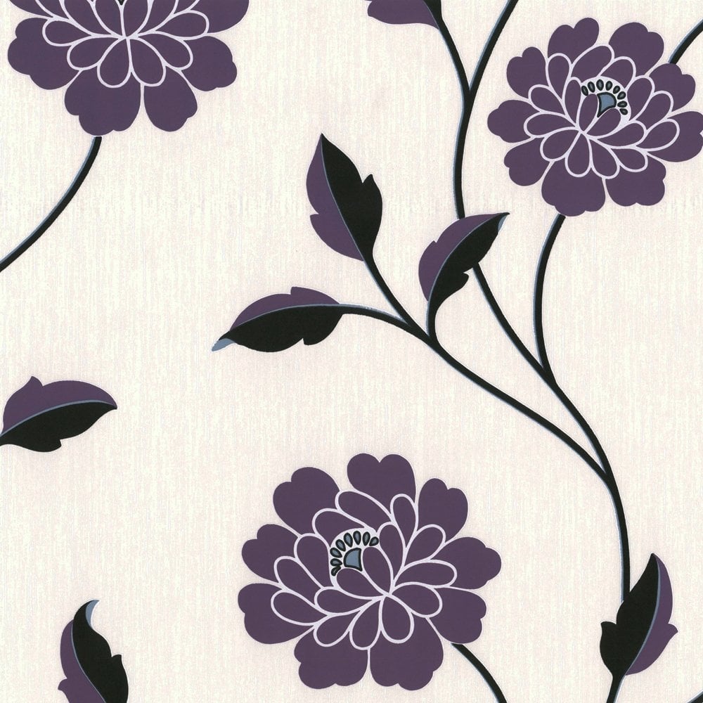 Description: A white and purple flower wallpaper with black leaves and flowers on it's side and a black and white background.