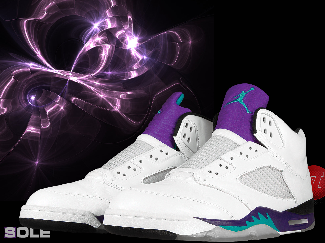 Description: A pair of white and purple shoes with a black background and a purple and blue design on the upper part of the shoe.