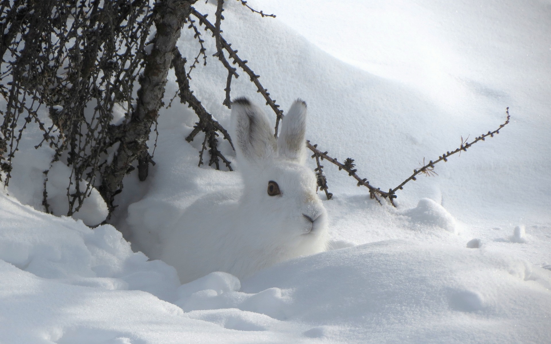 Description: A white rabbit is sitting in the snow near a tree branch and a bush with snow on it.