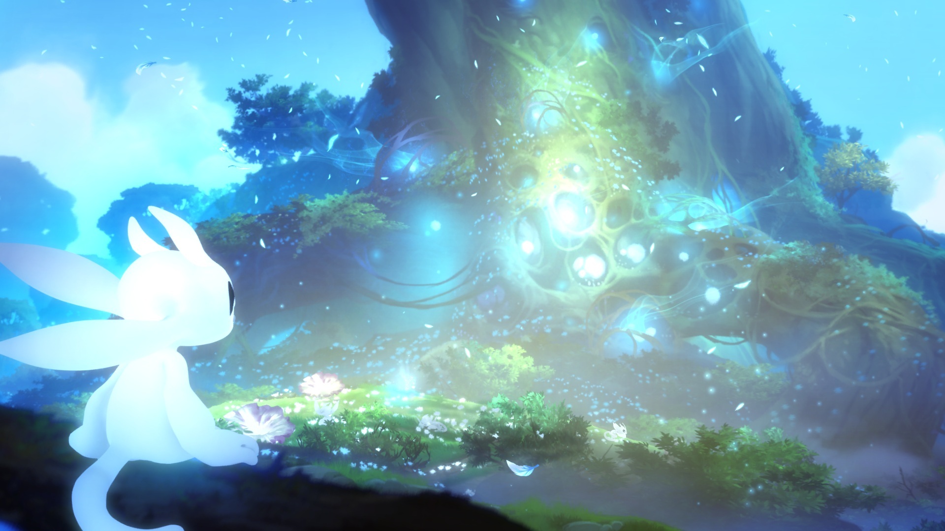 Description: A white rabbit standing in front of a tree in a forest with a giant mushroom in the background and a glowing tree in the foreground.