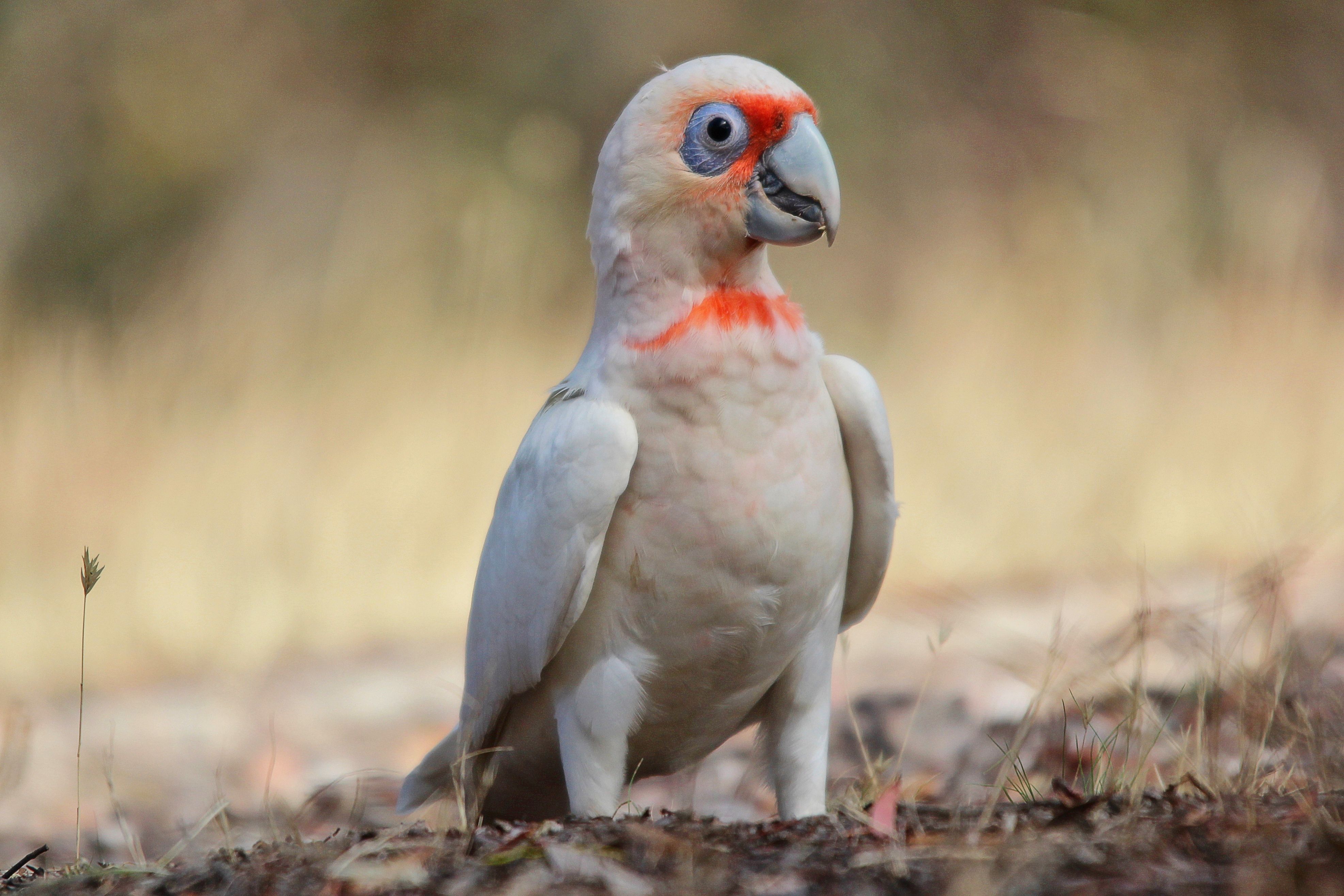 Description: A white and red bird standing on top of a field of grass and dirt with a blurry background.