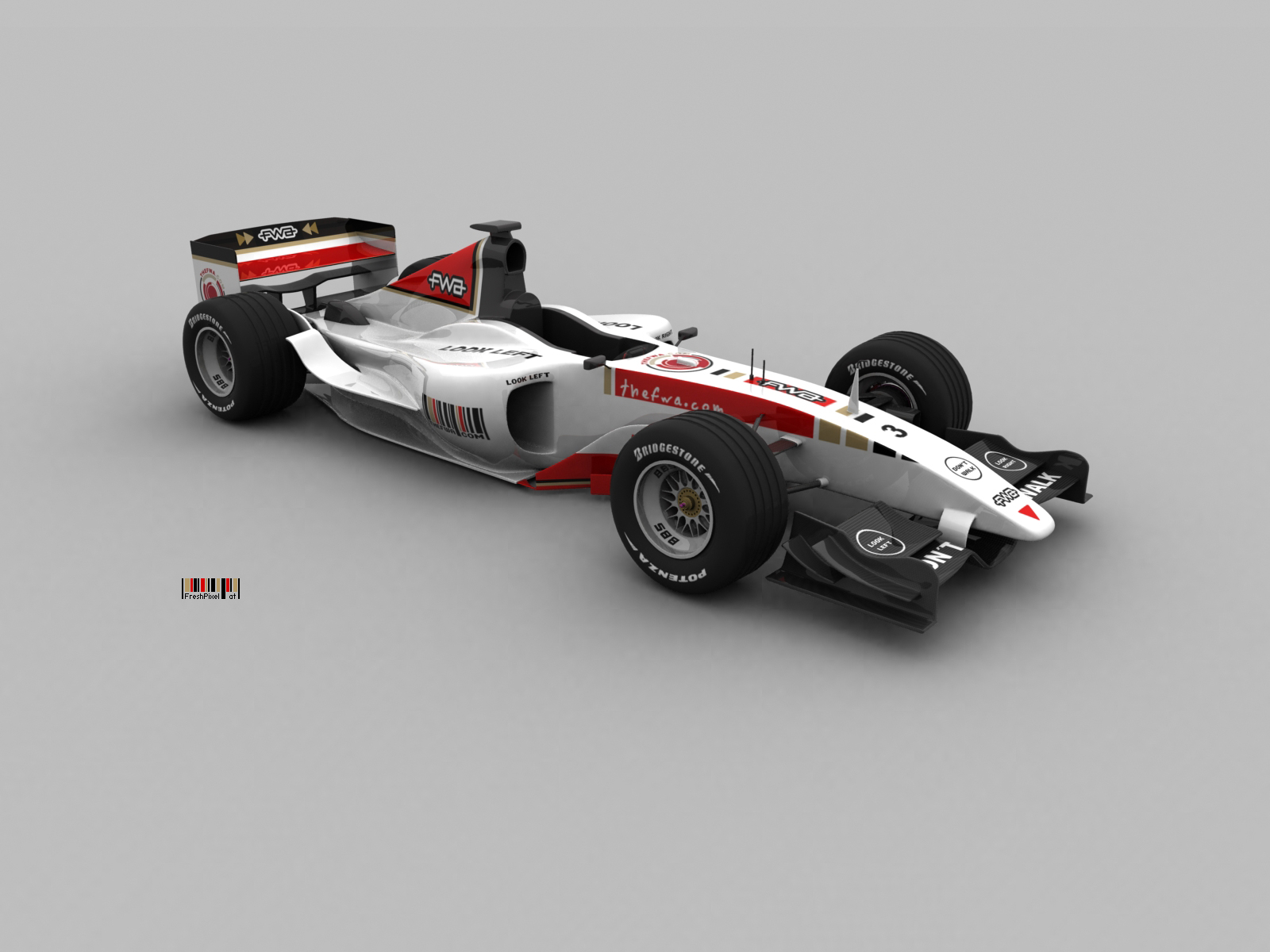 Description: A white and red race car on a gray background with a black and red stripe on the side of the car.