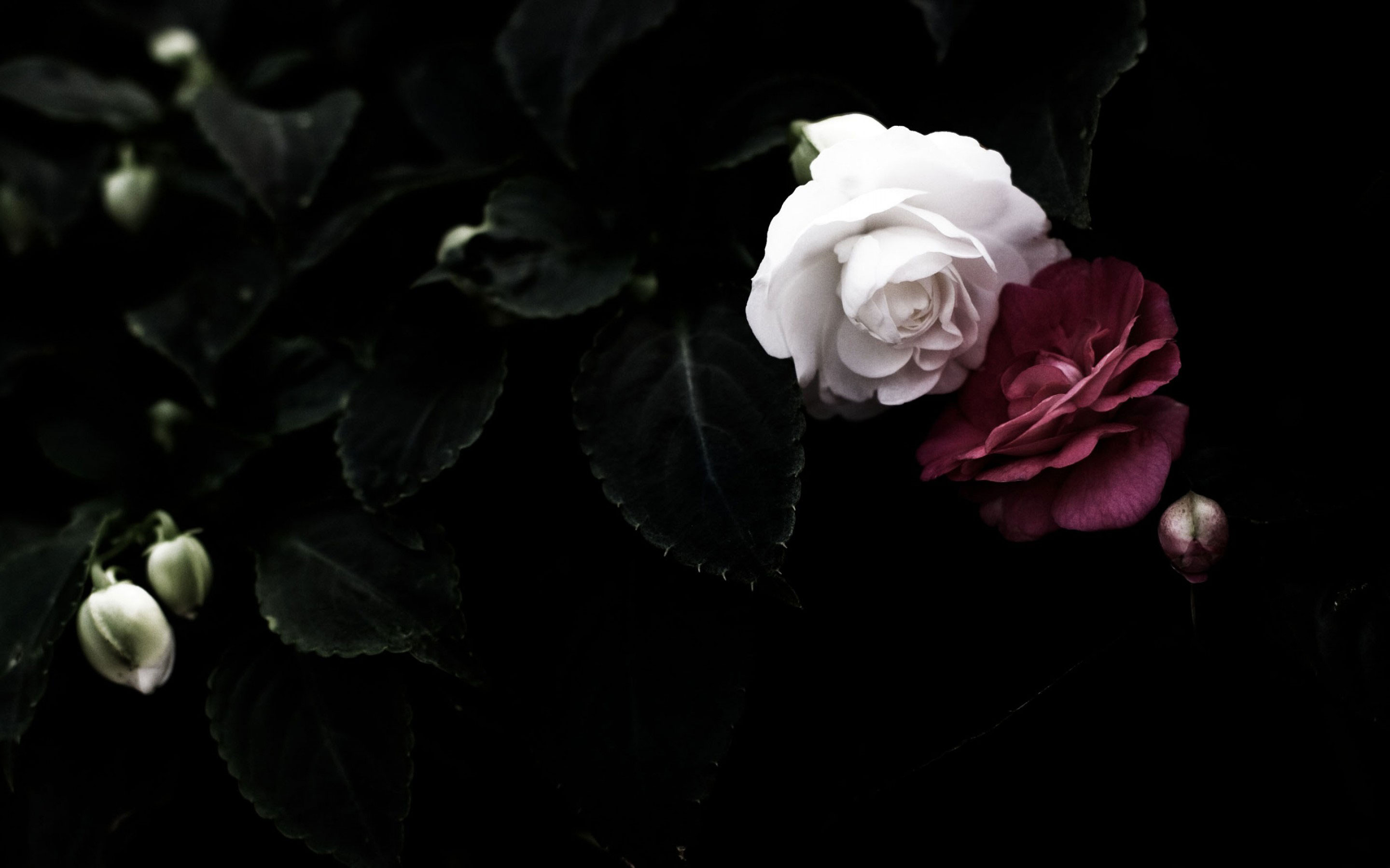 Description: A white and red rose are in the dark with leaves on the ground and on the ground.