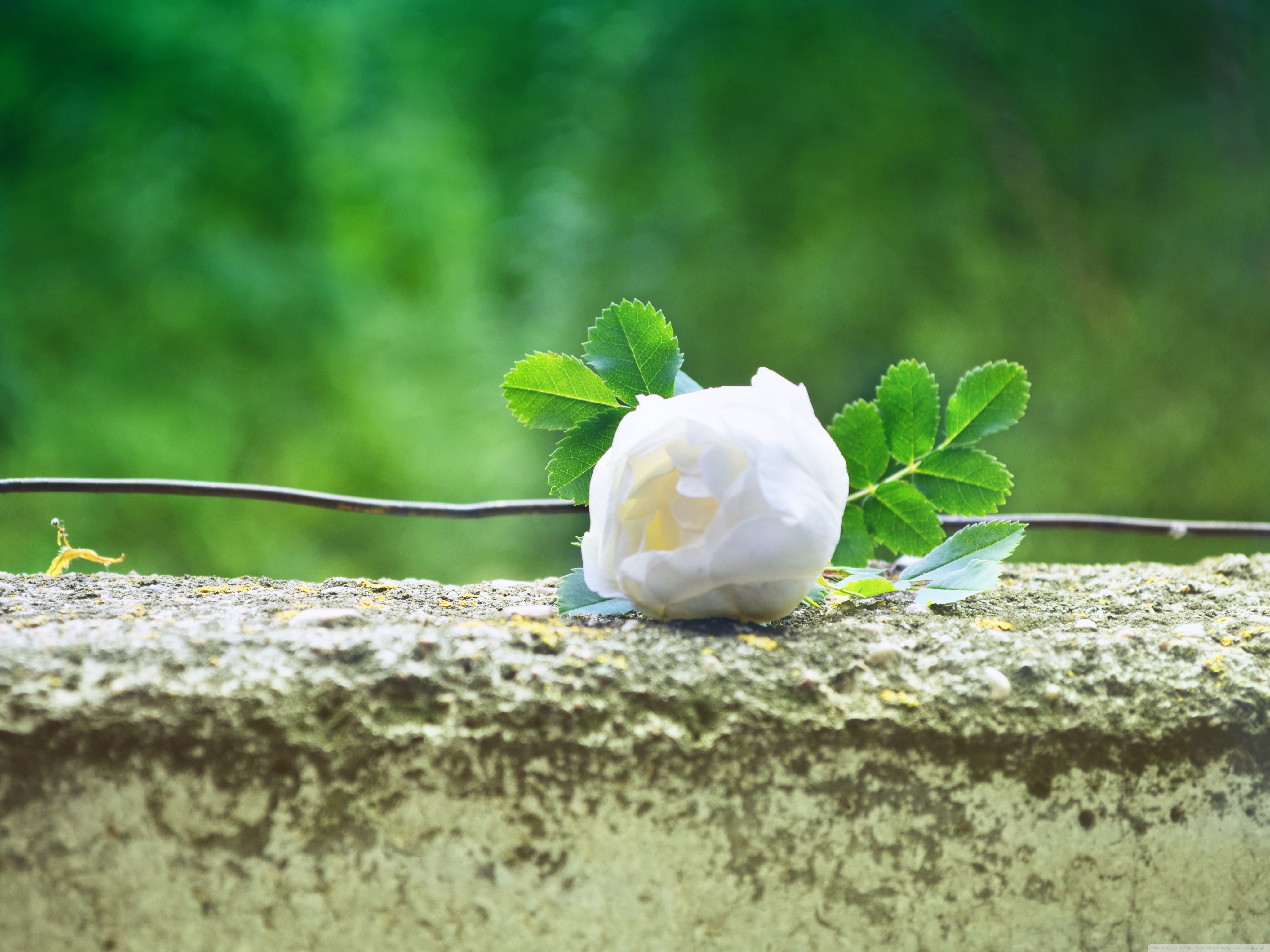 Description: A white rose is sitting on a stone wall with a green background and a wire running through it.