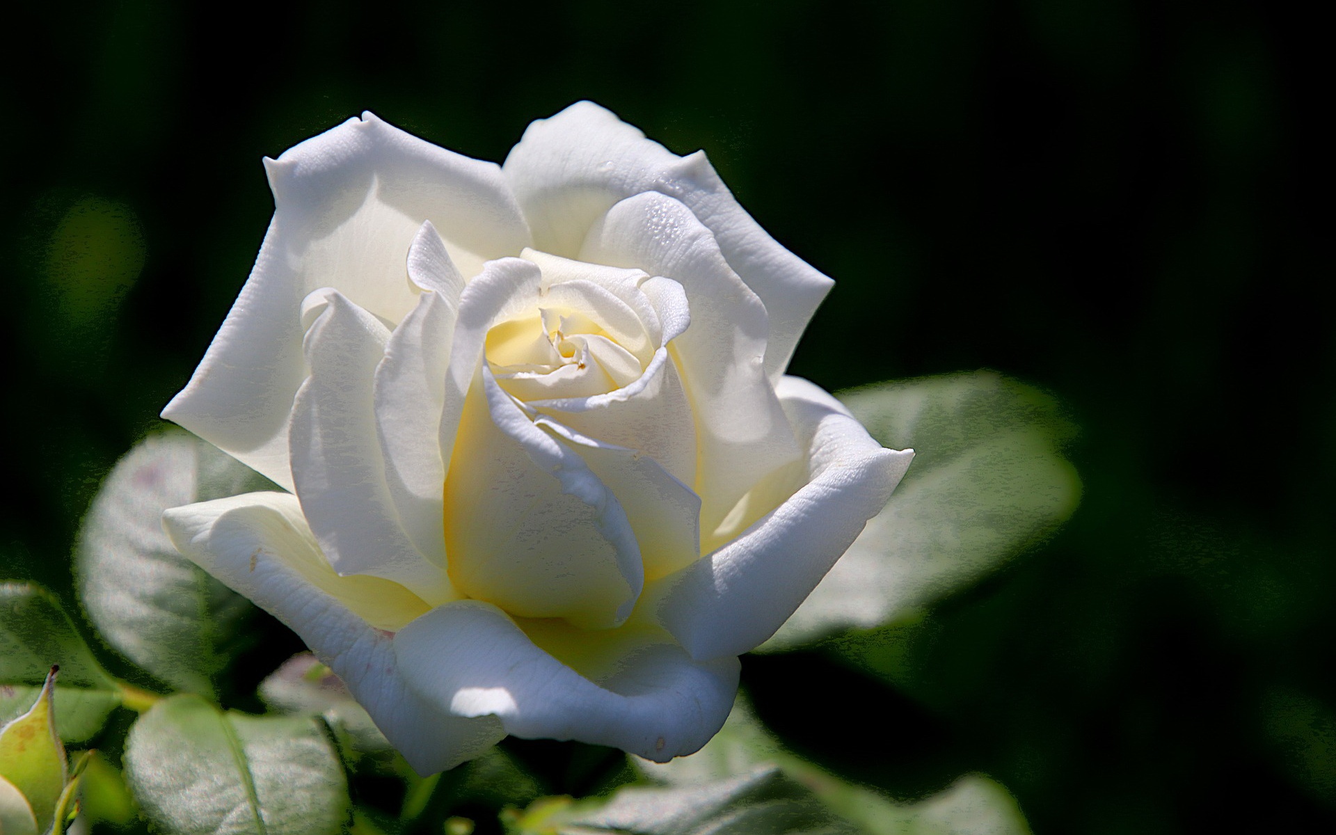 Description: A white rose with a yellow center in the sun with green leaves around it and a dark background behind it.