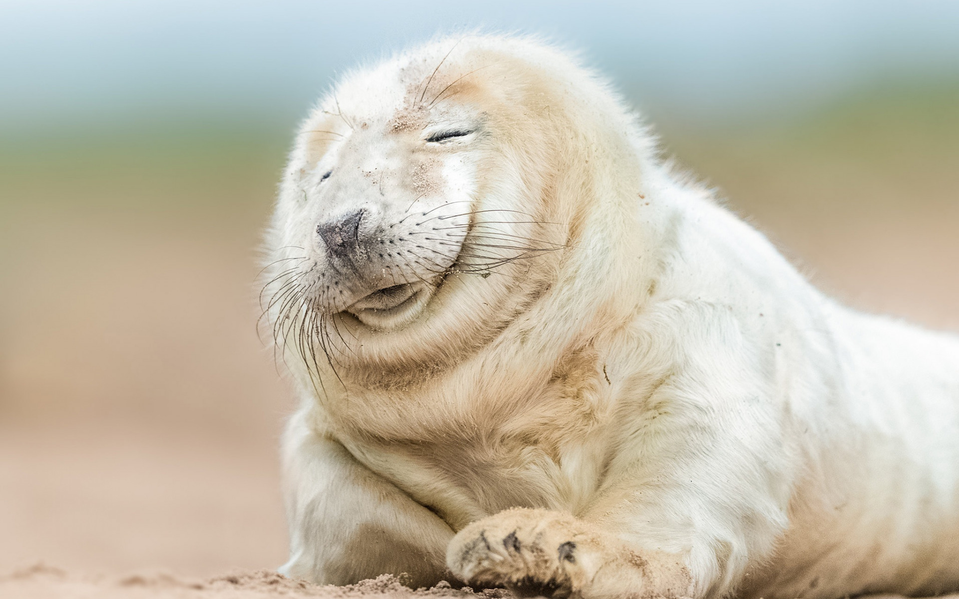Description: A white seal laying on top of a sandy beach next to a green field and a blue sky in the background.