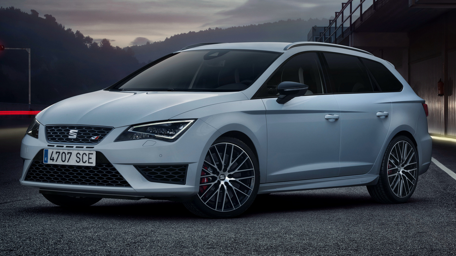 Description: A white seat atex parked in a parking lot at night with a red light behind it and a dark sky.