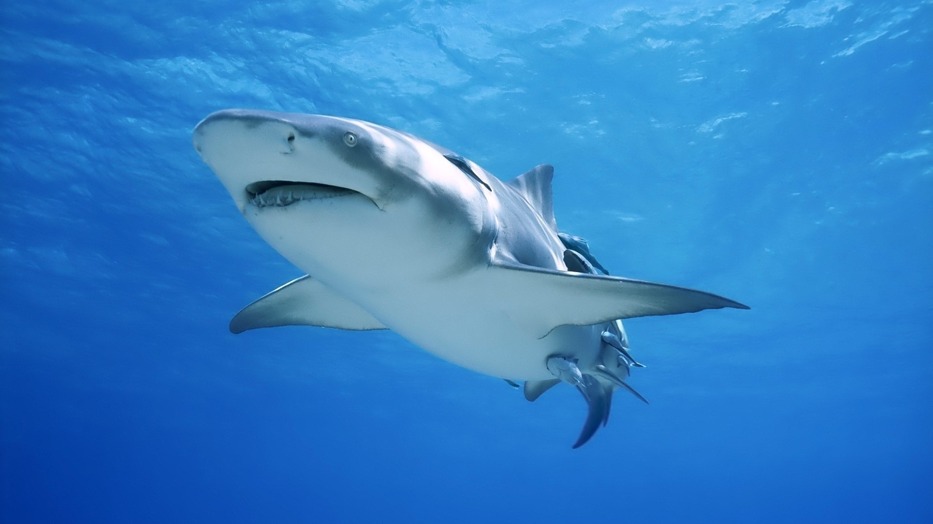 Description: A large white shark swimming in the ocean water with a blue background and a few white sharks swimming around.