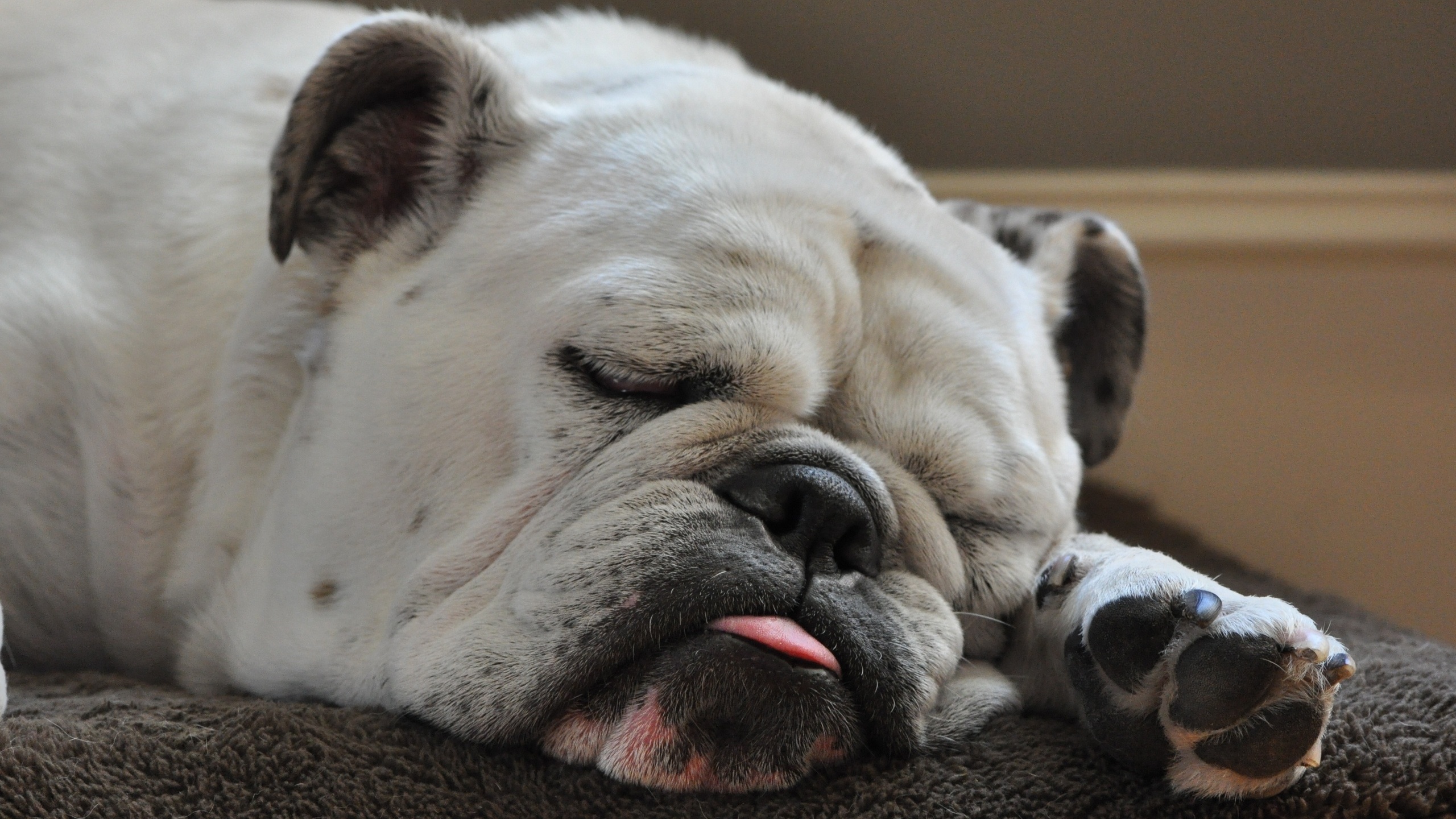 Description: A white dog laying on top of a brown blanket on a floor next to a wall and a window.