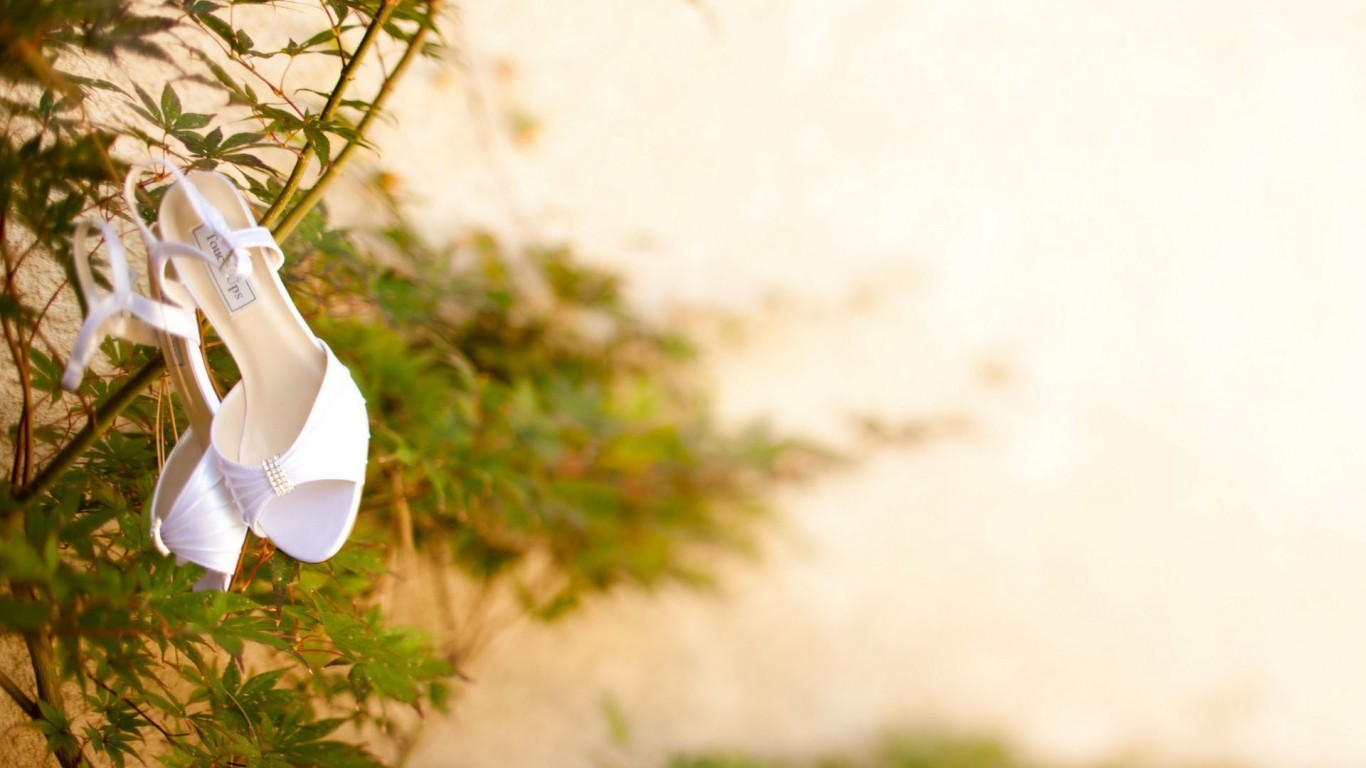 Description: A pair of white shoes hanging from a tree branch with a white wall in the background behind them and a green bush.