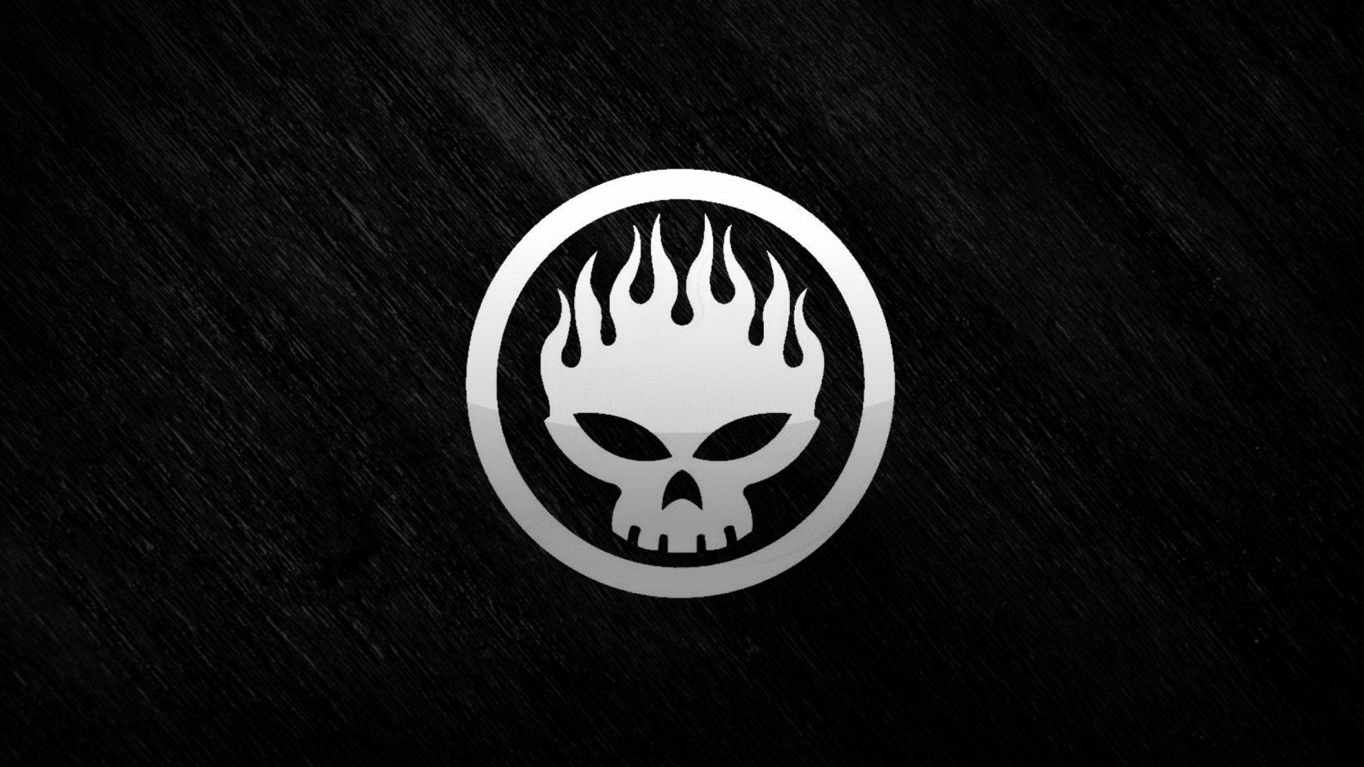 Description: A white skull with flames on it's face in a circle on a black background with a white circle.