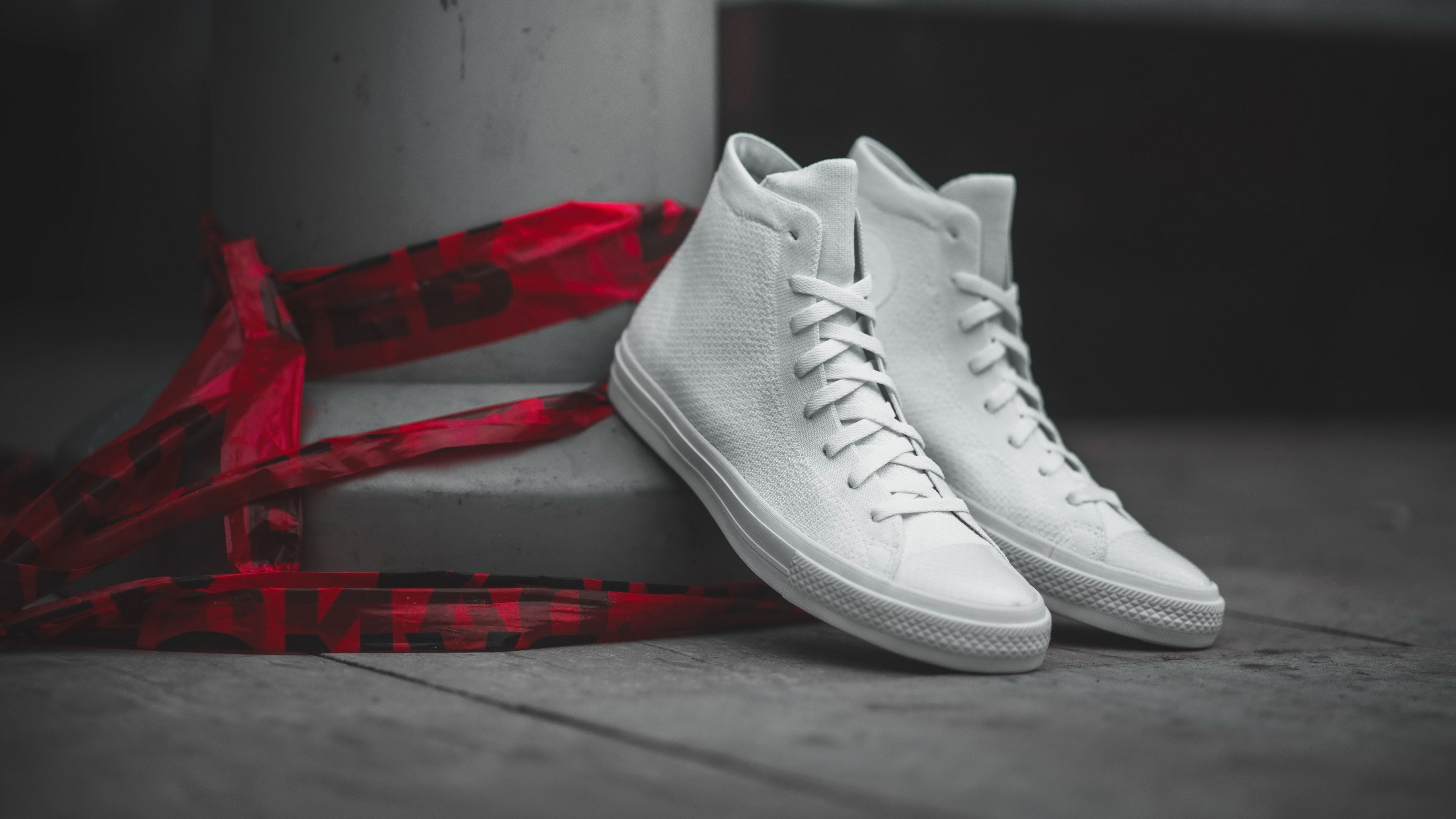 Description: A pair of white sneakers with a red ribbon tied around them on a sidewalk next to a pole with a red ribbon.