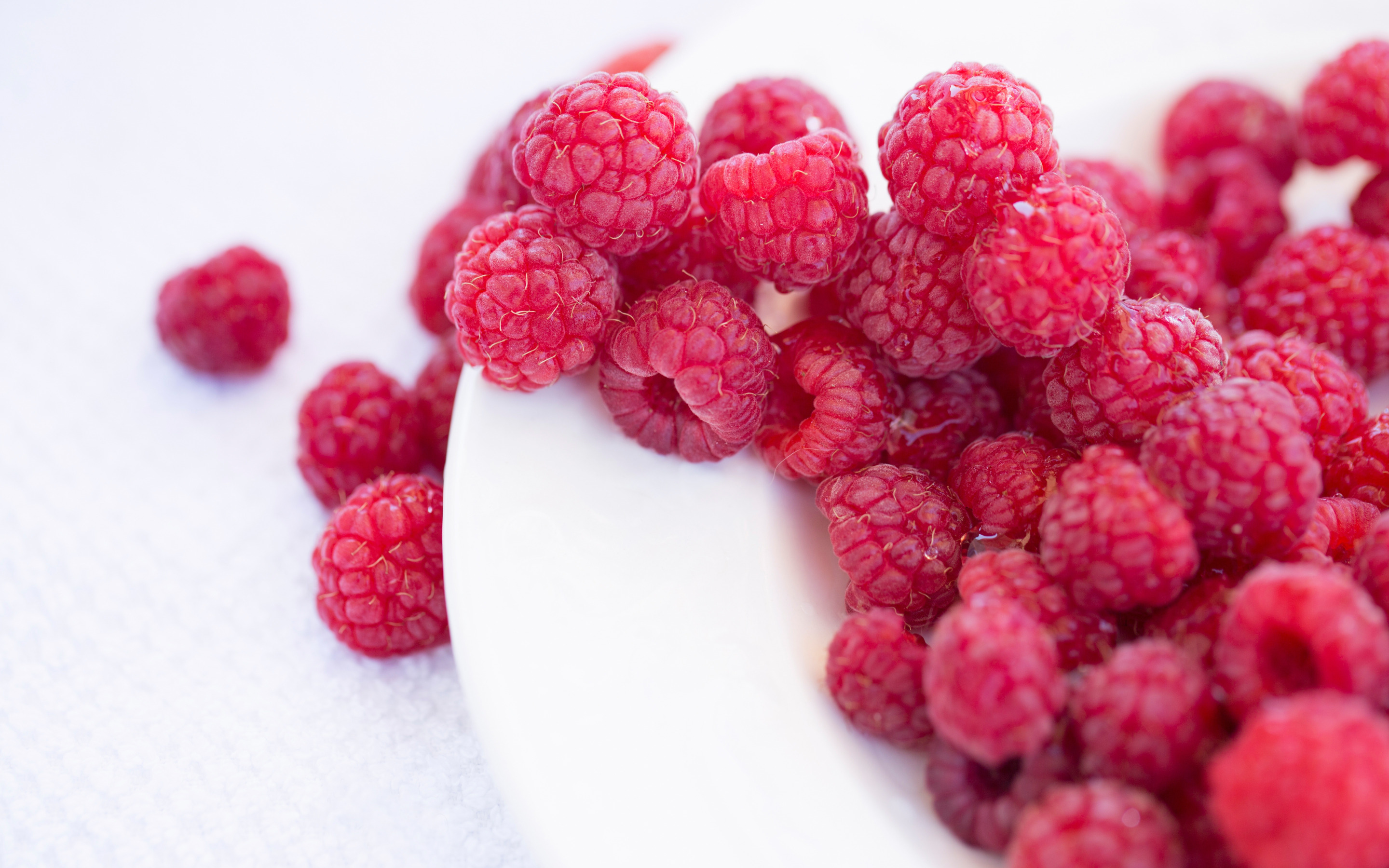 Description: A white spoon filled with raspberries on top of a table cloth with a white cloth underneath it.