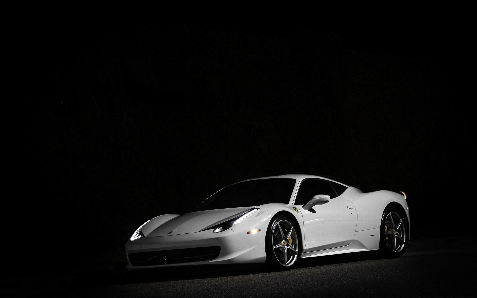 Description: A white sports car in the dark with a black background and a spot light on the side of the car.