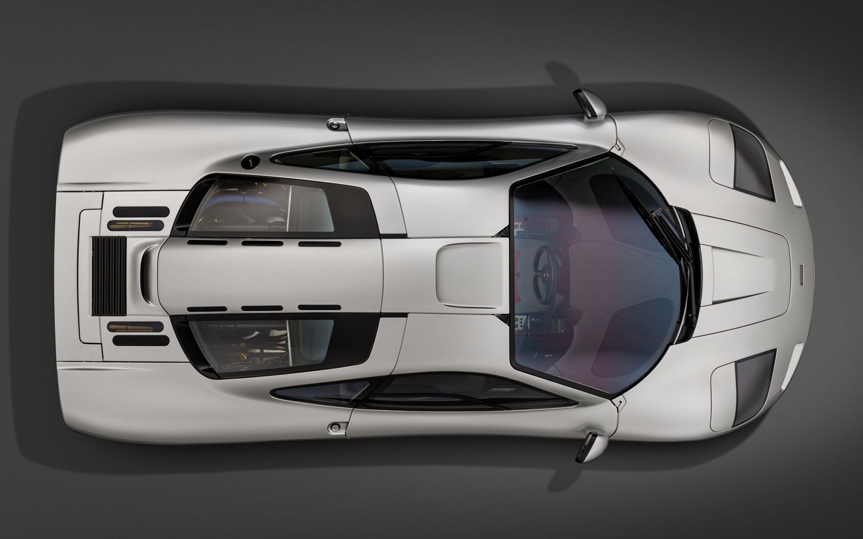 Description: A white sports car with a black roof and a gray background is shown from above.