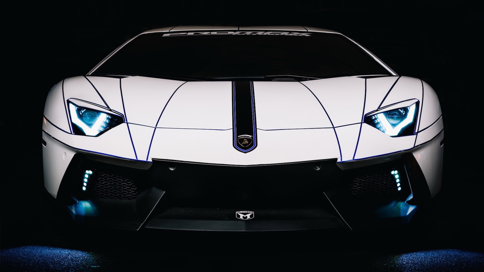 Description: A white sports car with blue lights on it's hood and headlights on it's side.