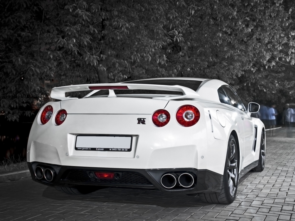 Description: A white sports car parked on a brick road at night with a black background and a tree in the background.