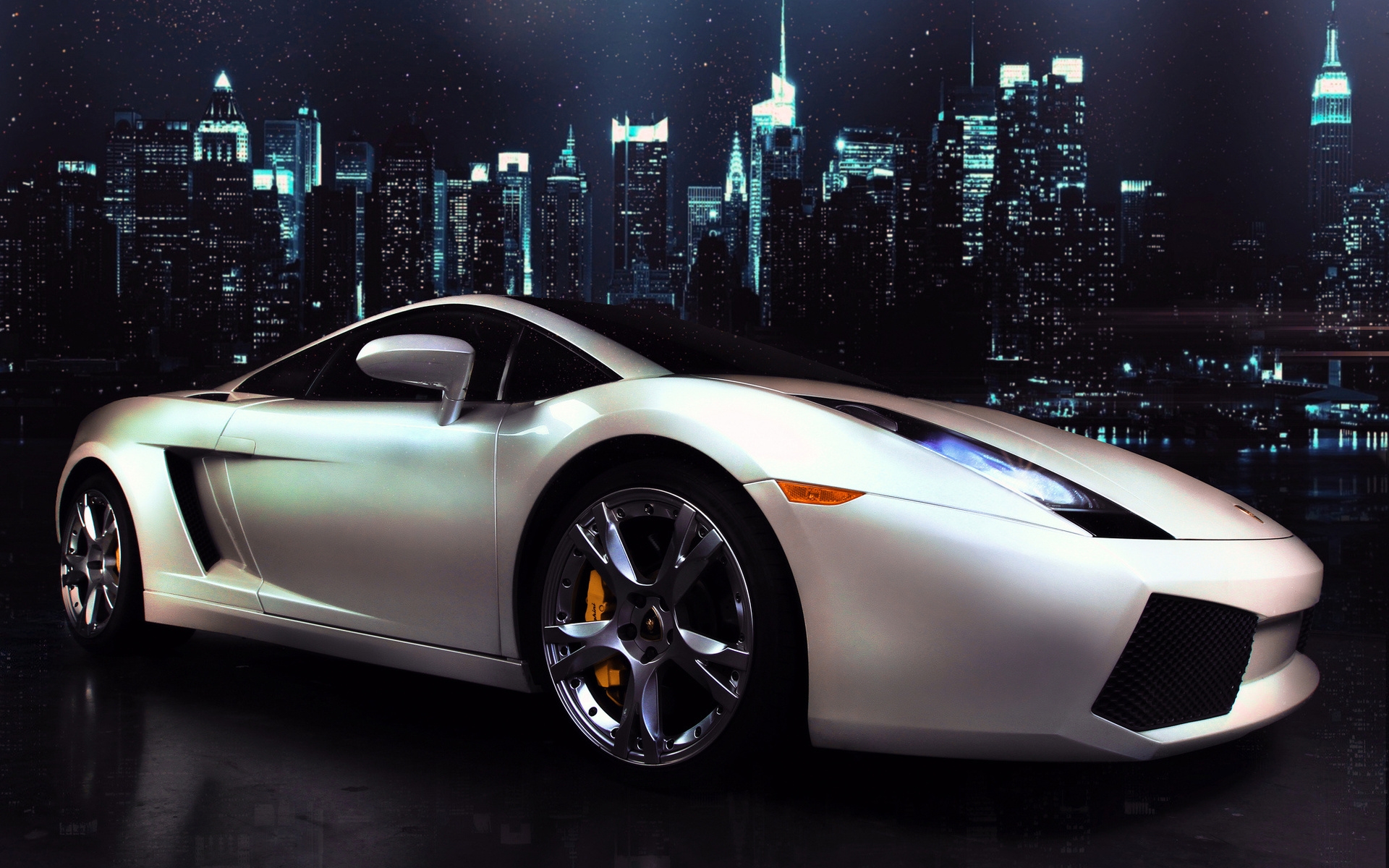 Description: A white sports car parked in front of a city skyline at night with lights on it's windows.