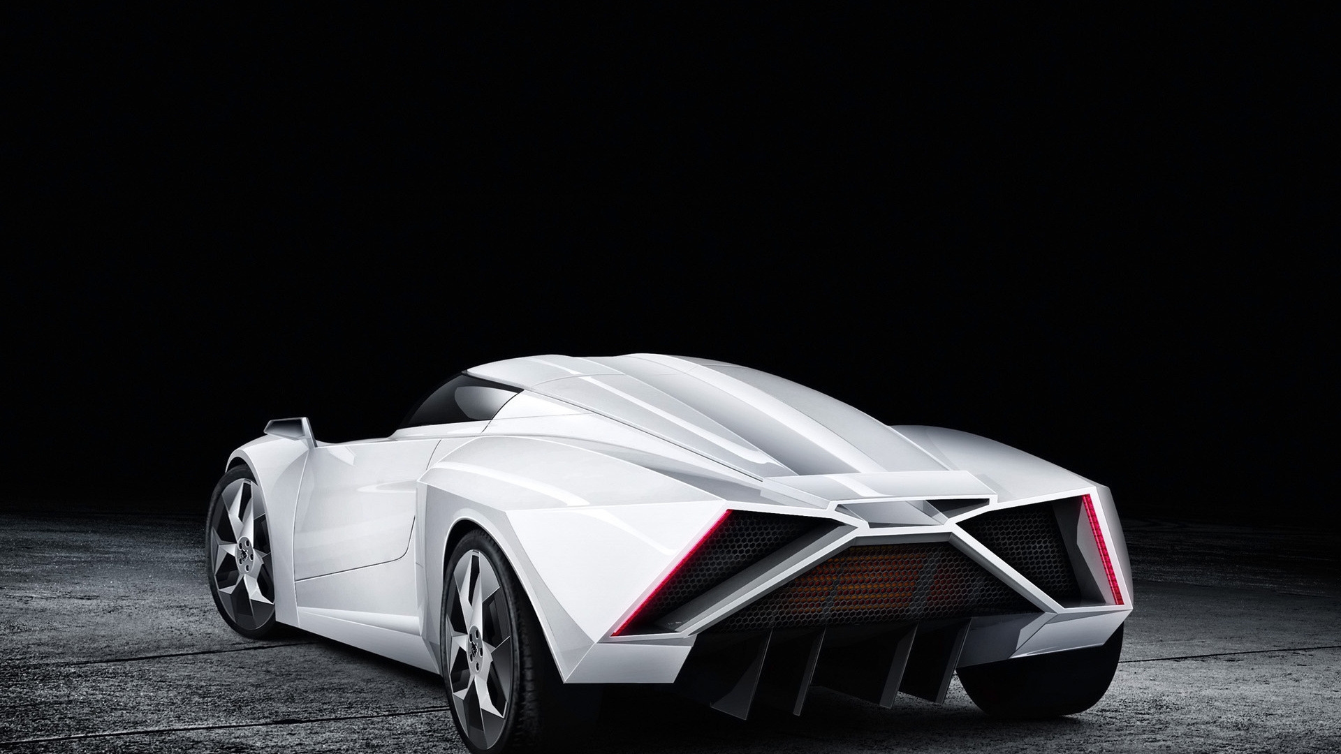 Description: A white sports car parked in a dark room with a black background and a black background behind it.