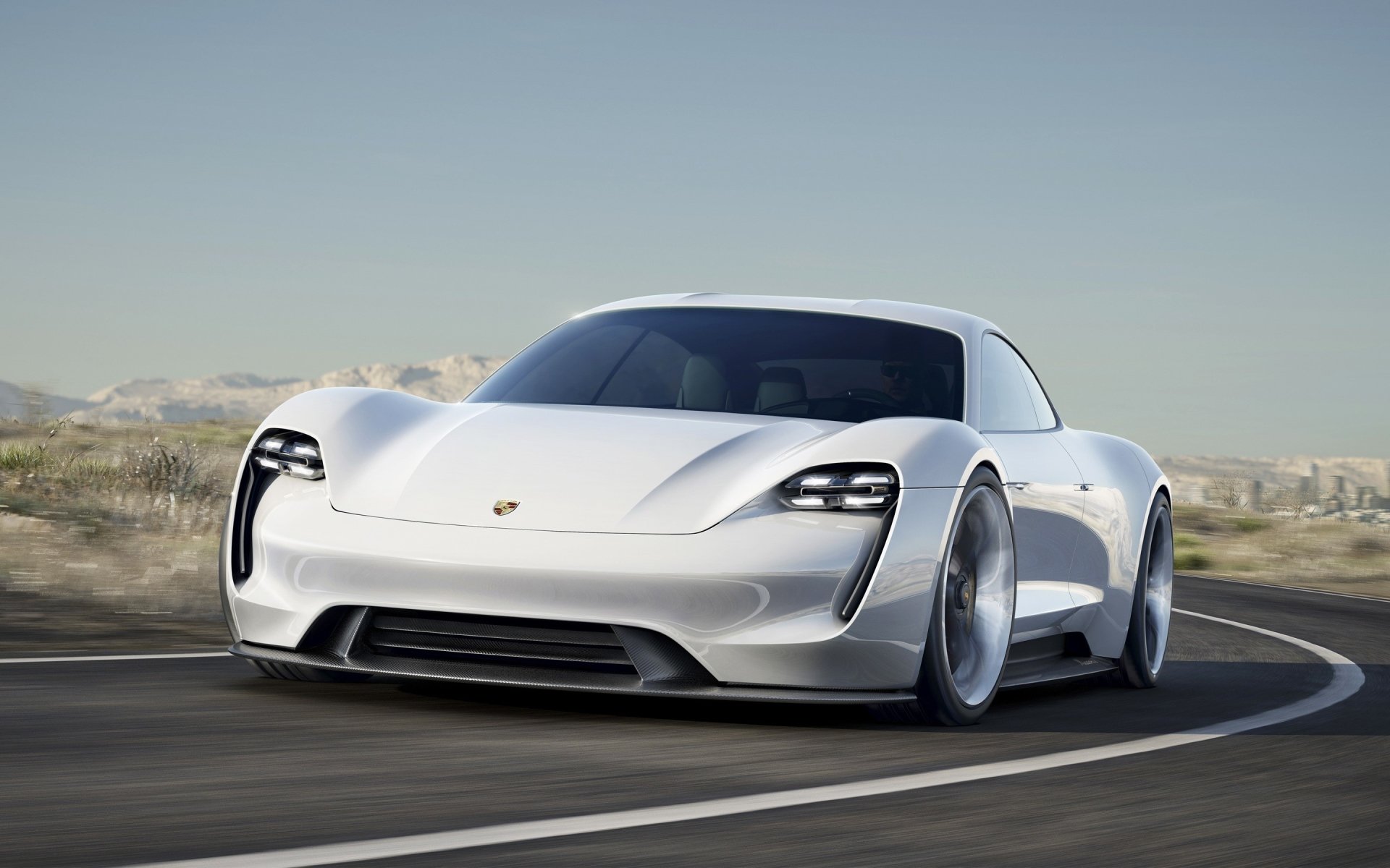 Description: A white sports car driving down a road in the desert with mountains in the background and a sky background.