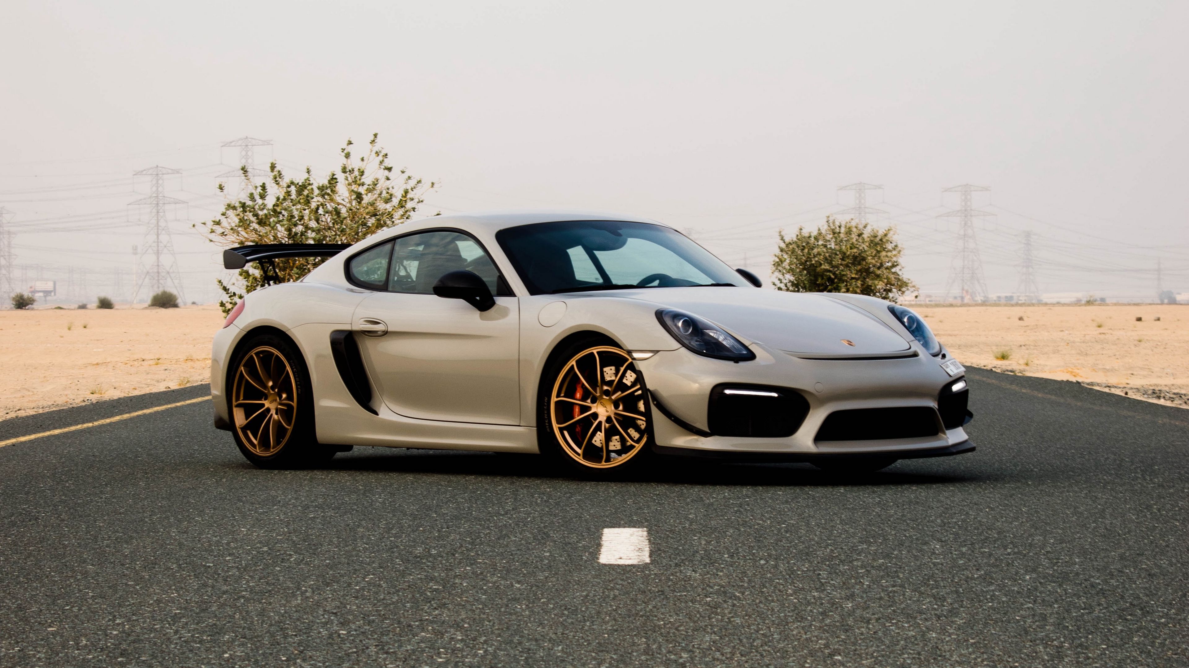 Description: A white sports car driving down a road next to a tree and power lines in the background.