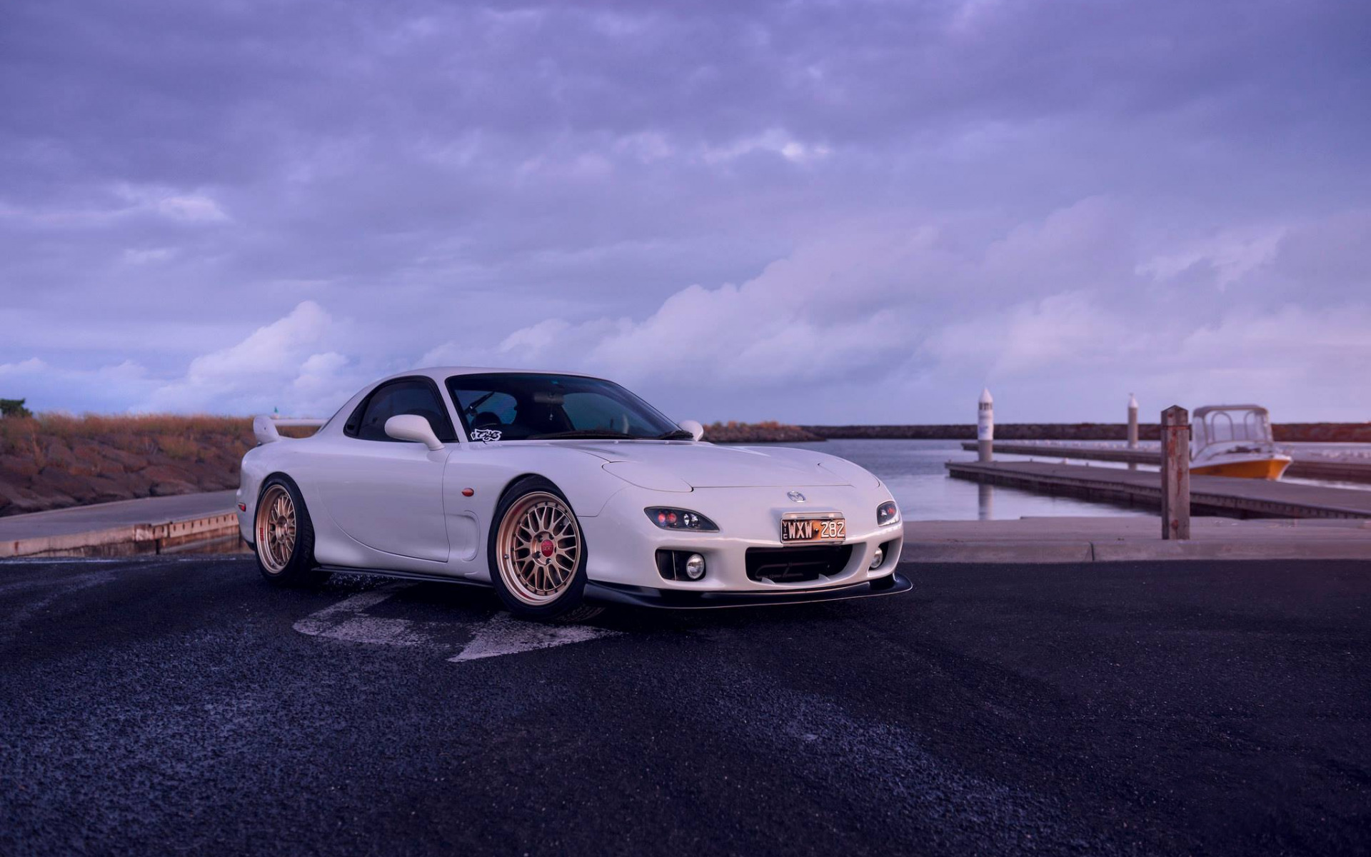 Description: A white sports car parked on the side of the road near a body of water at dusk with a cloudy sky.