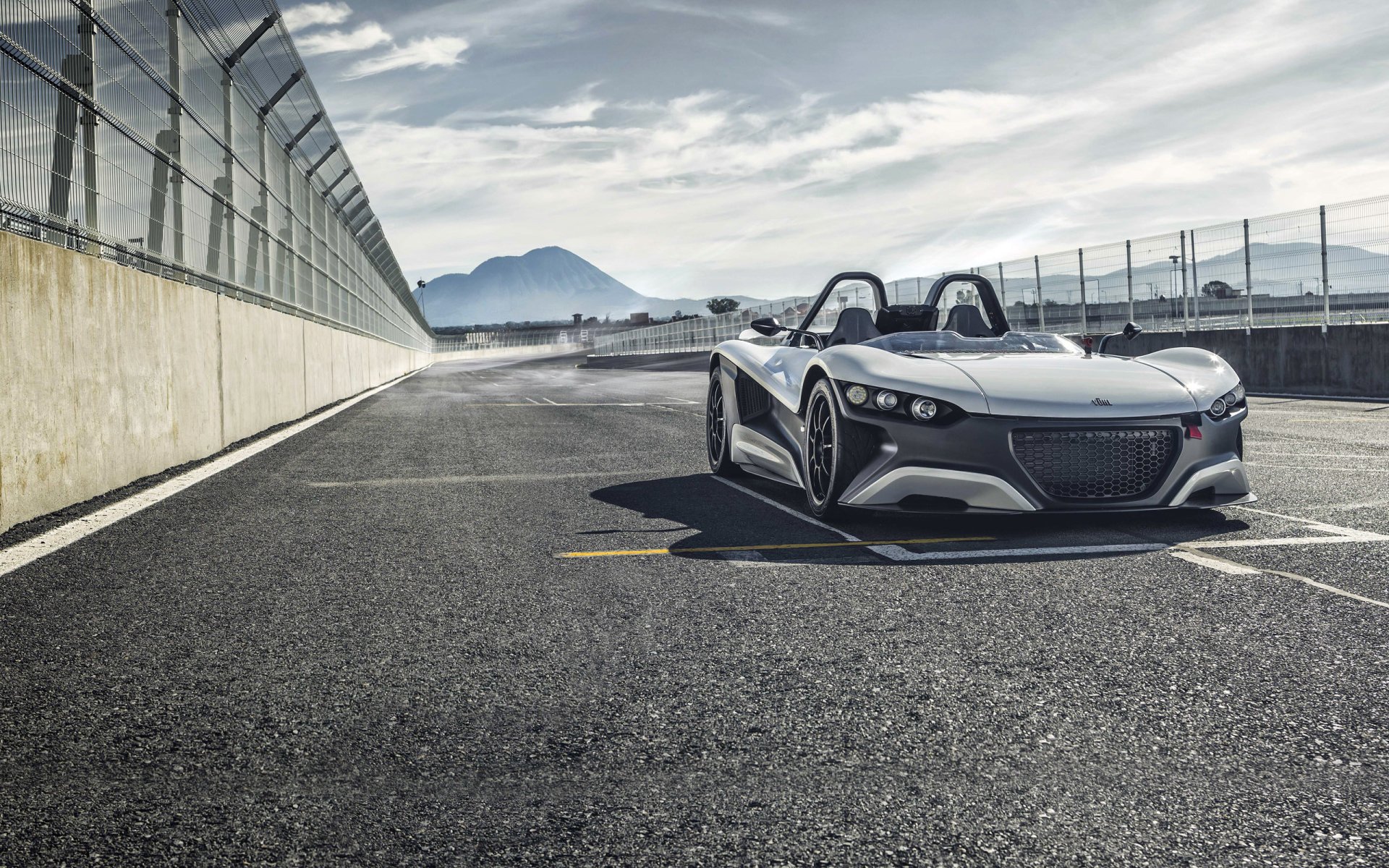 Description: A white sports car parked in a parking lot next to a fence and mountains in the background with a cloudy sky.