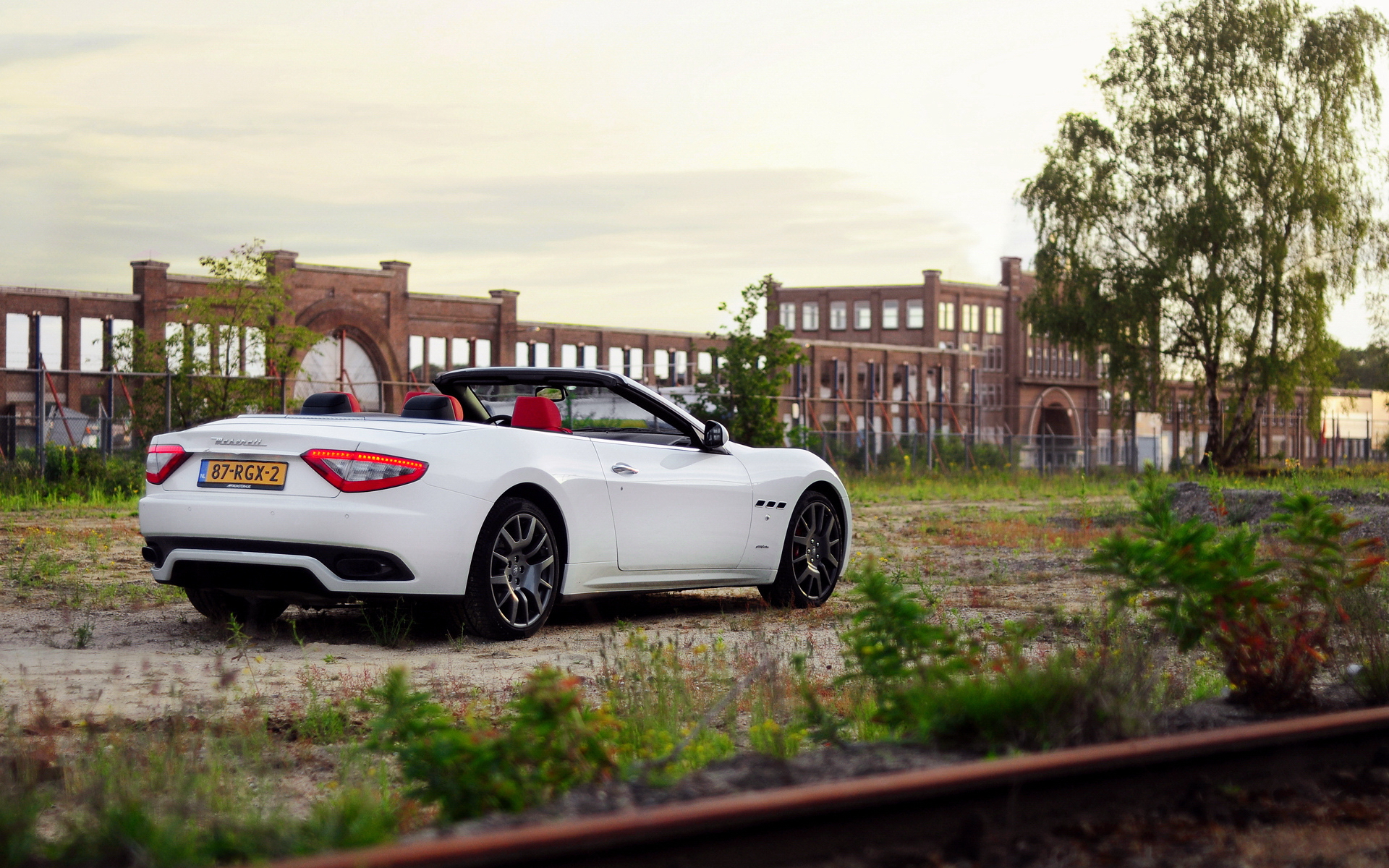 Description: A white sports car parked in a field near a building and trees with a red top on it's roof.