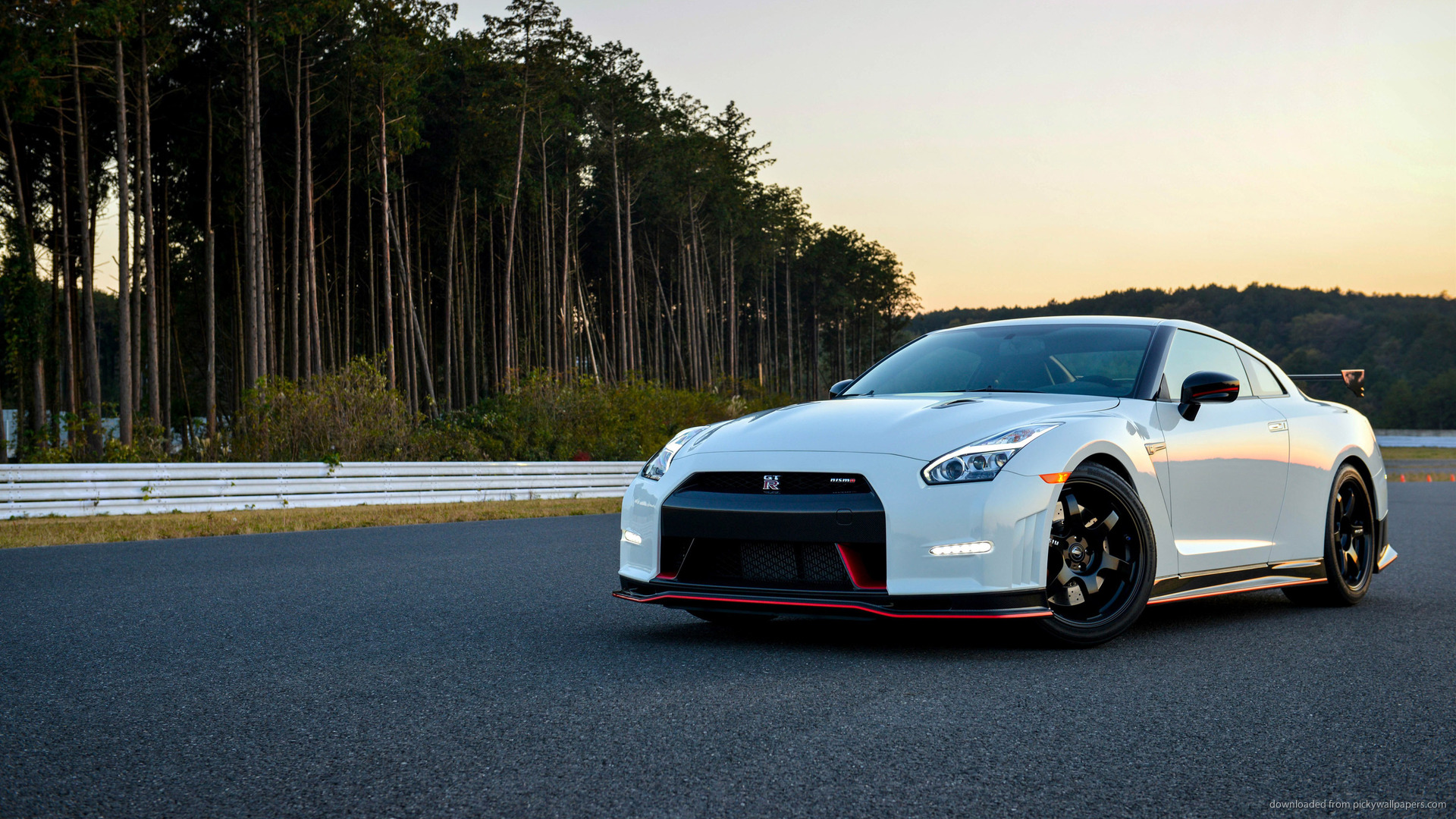 Description: A white sports car driving down a road next to a forest of trees at sunset or dawn with a red stripe.