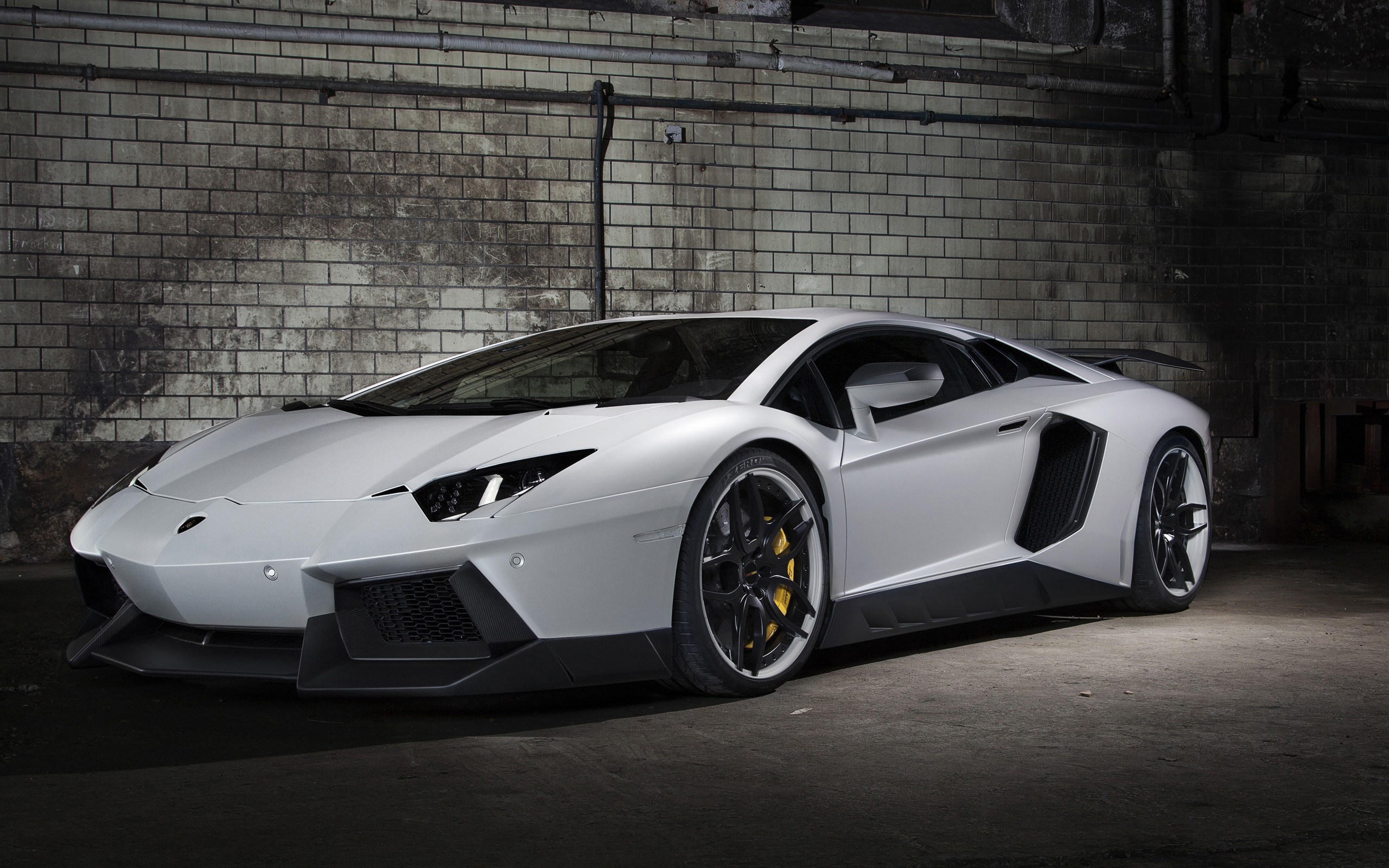 Description: A white sports car parked in a garage next to a brick wall and a brick wall behind it is a dark room.