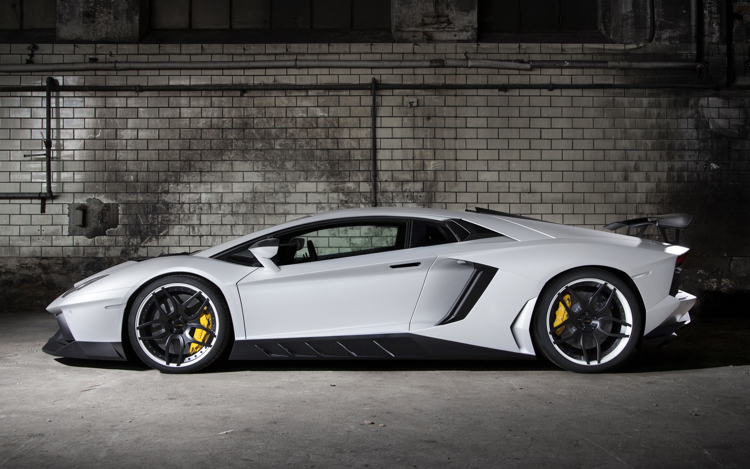 Description: A white sports car parked in a garage next to a brick wall and a door with a window open.