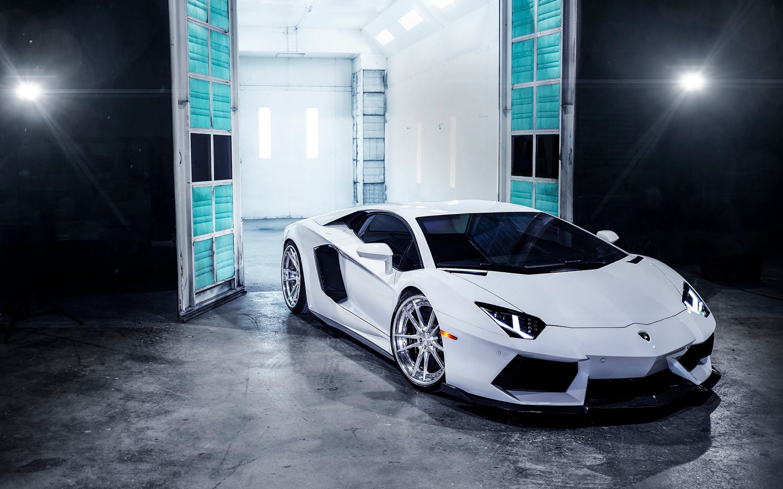 Description: A white sports car parked in a garage with bright lights on the windows and doors open to the street.