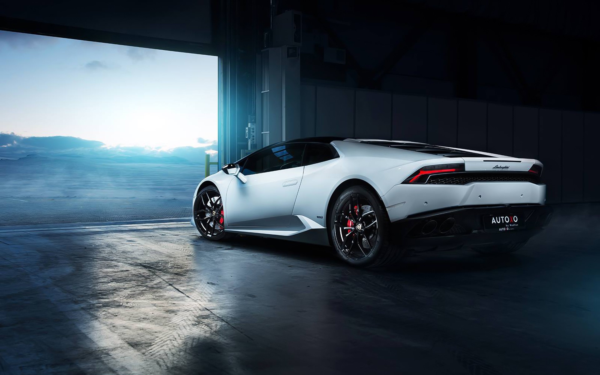 Description: A white sports car parked in a garage with a window open to the side of it and a mountain in the background.