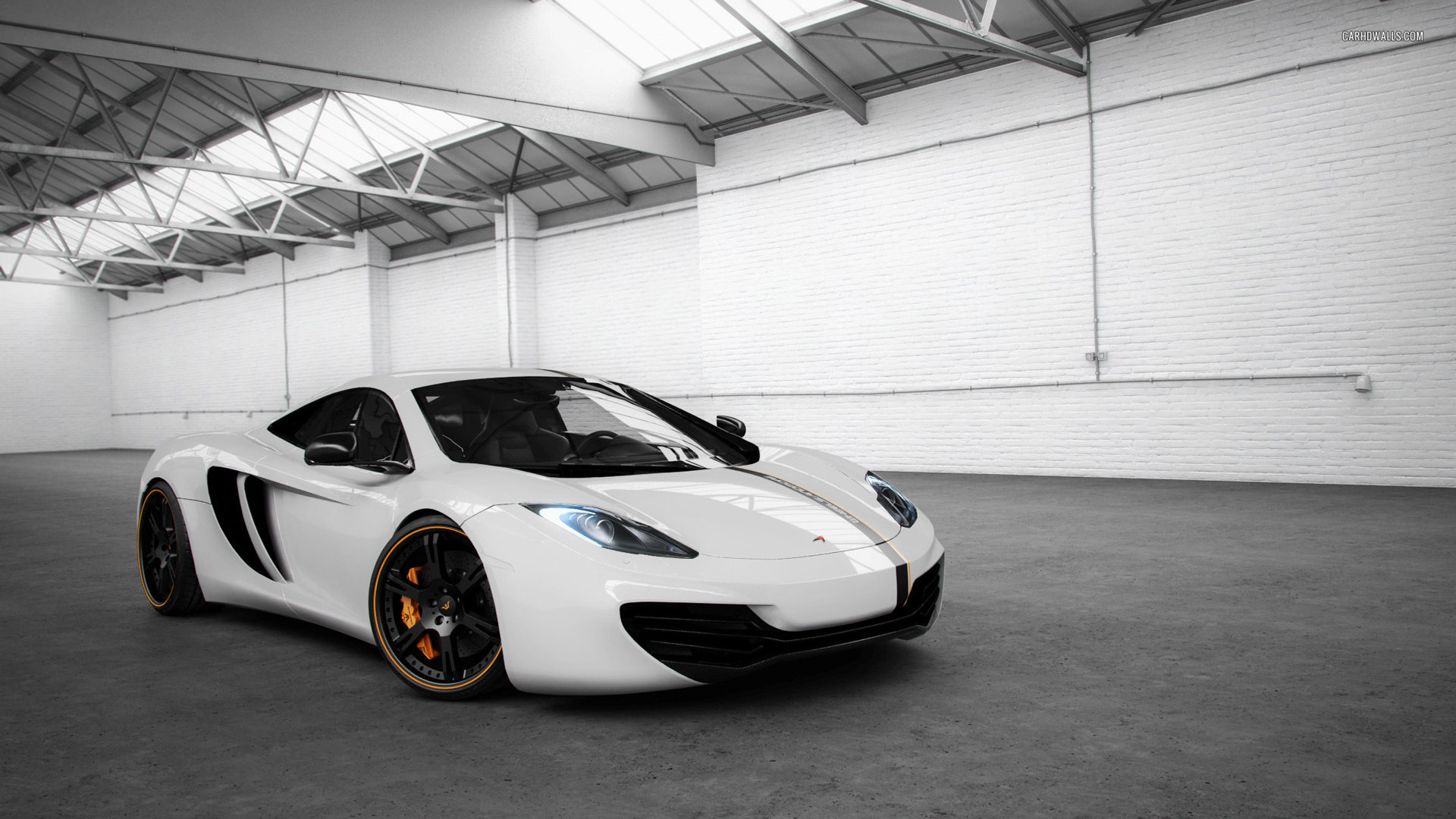 Description: A white sports car parked in a garage with a roof down and a white brick wall behind it and a white brick wall.