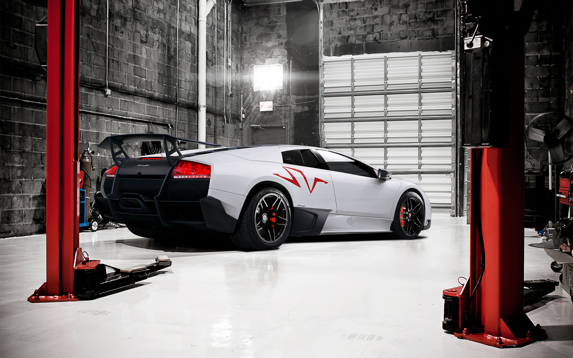 Description: A white sports car parked in a garage with a red pole and a red light on the side of the car.