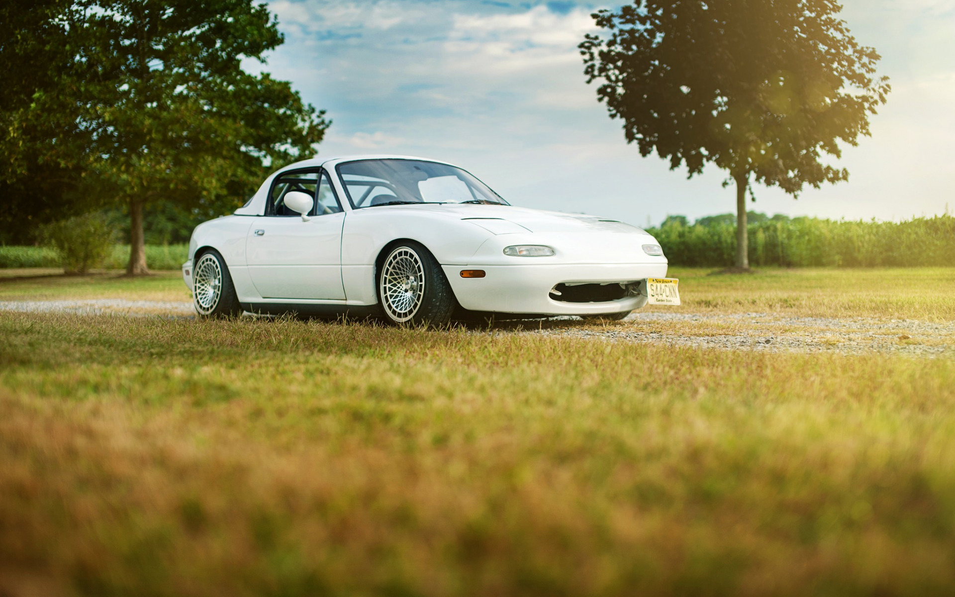 Description: A white sports car parked in a field of grass near trees and a dirt road with a gravel road leading to it.
