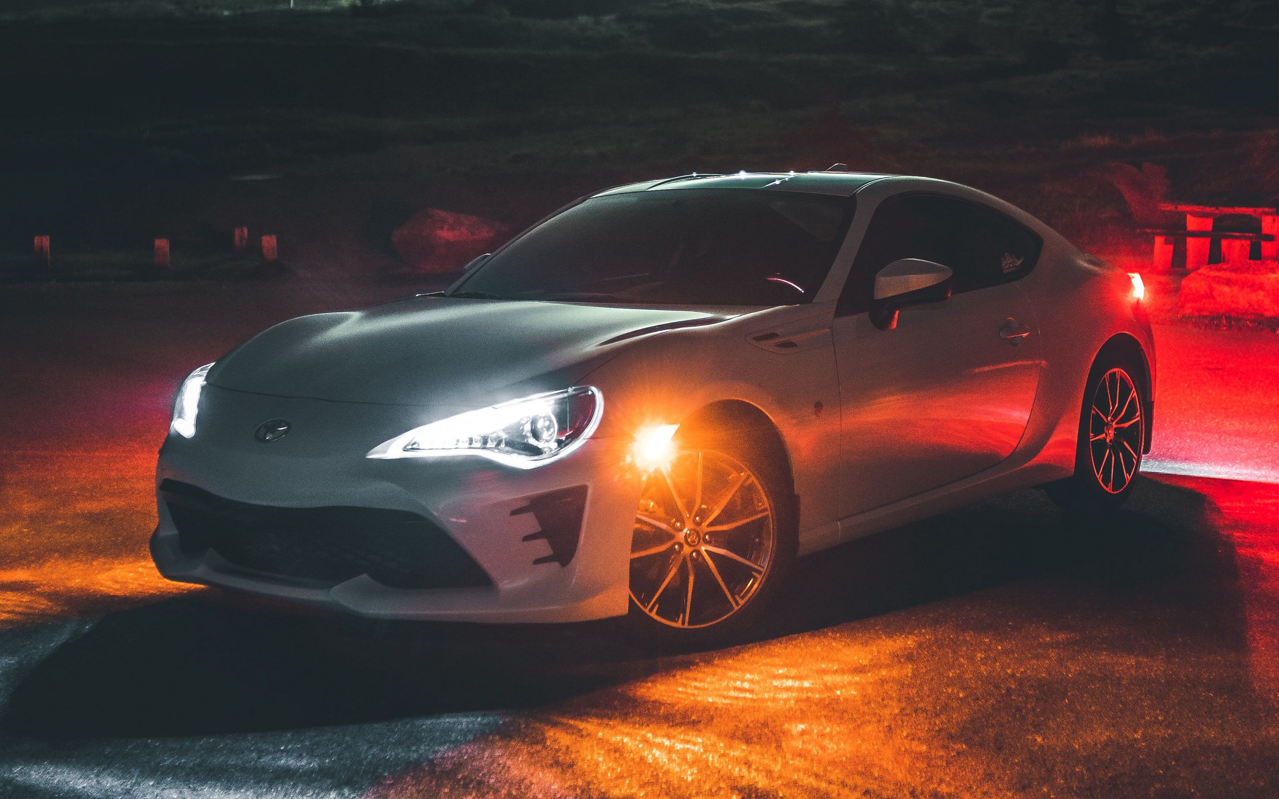 Description: A white sports car with its headlights on in the dark with a red light behind it and a red light behind it.
