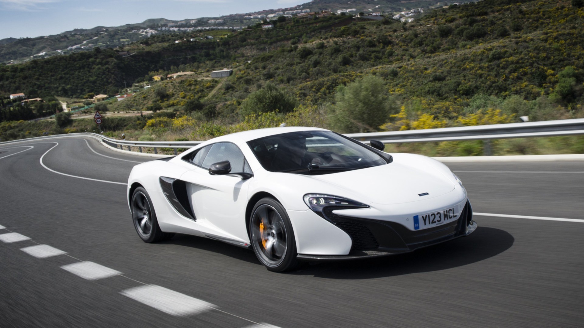 Description: A white sports car driving down a road next to a hillside and trees in the background with a blue sky.