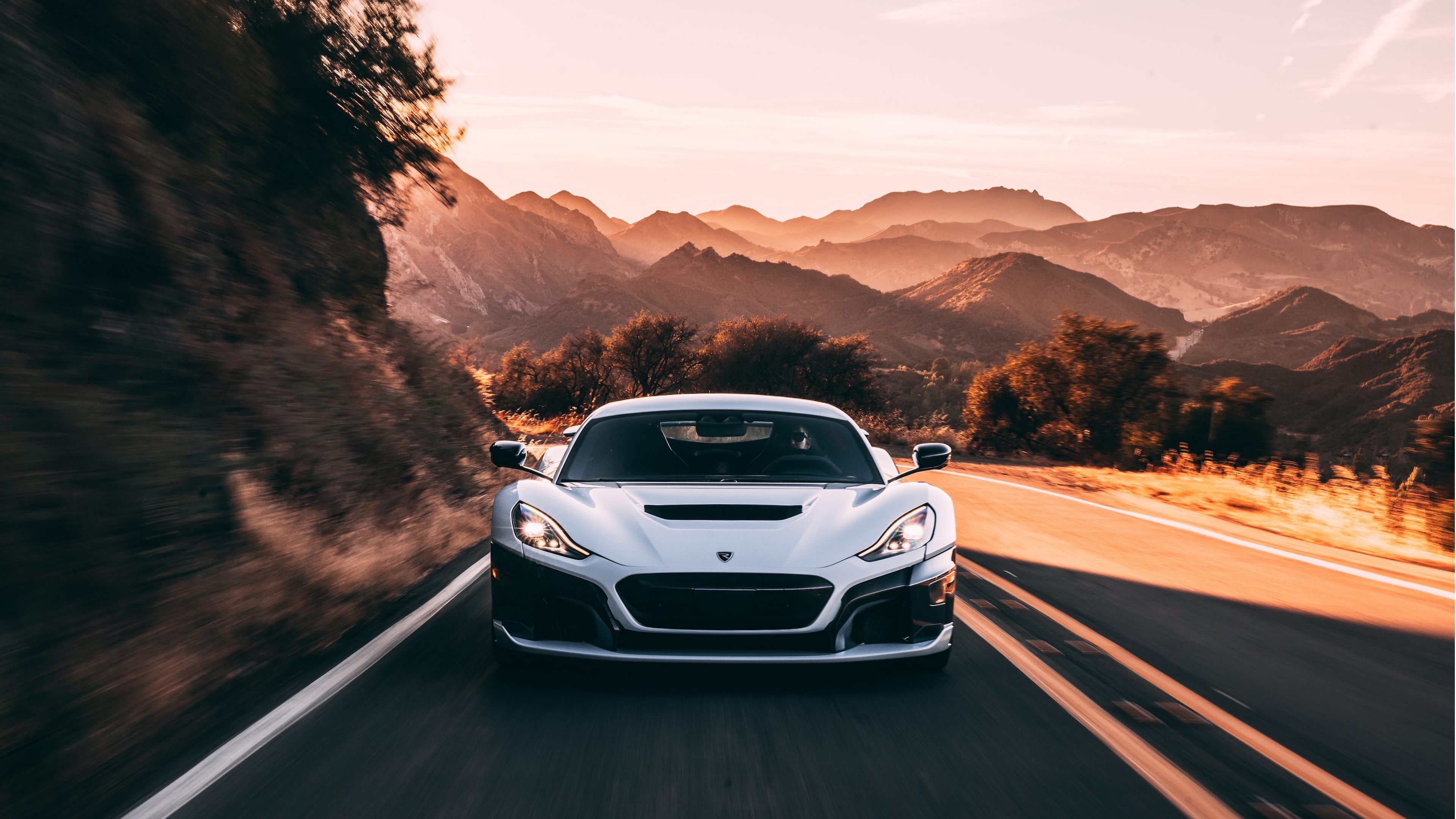 Description: A white sports car driving down a road in the mountains at sunset or dawn with a blurry background.