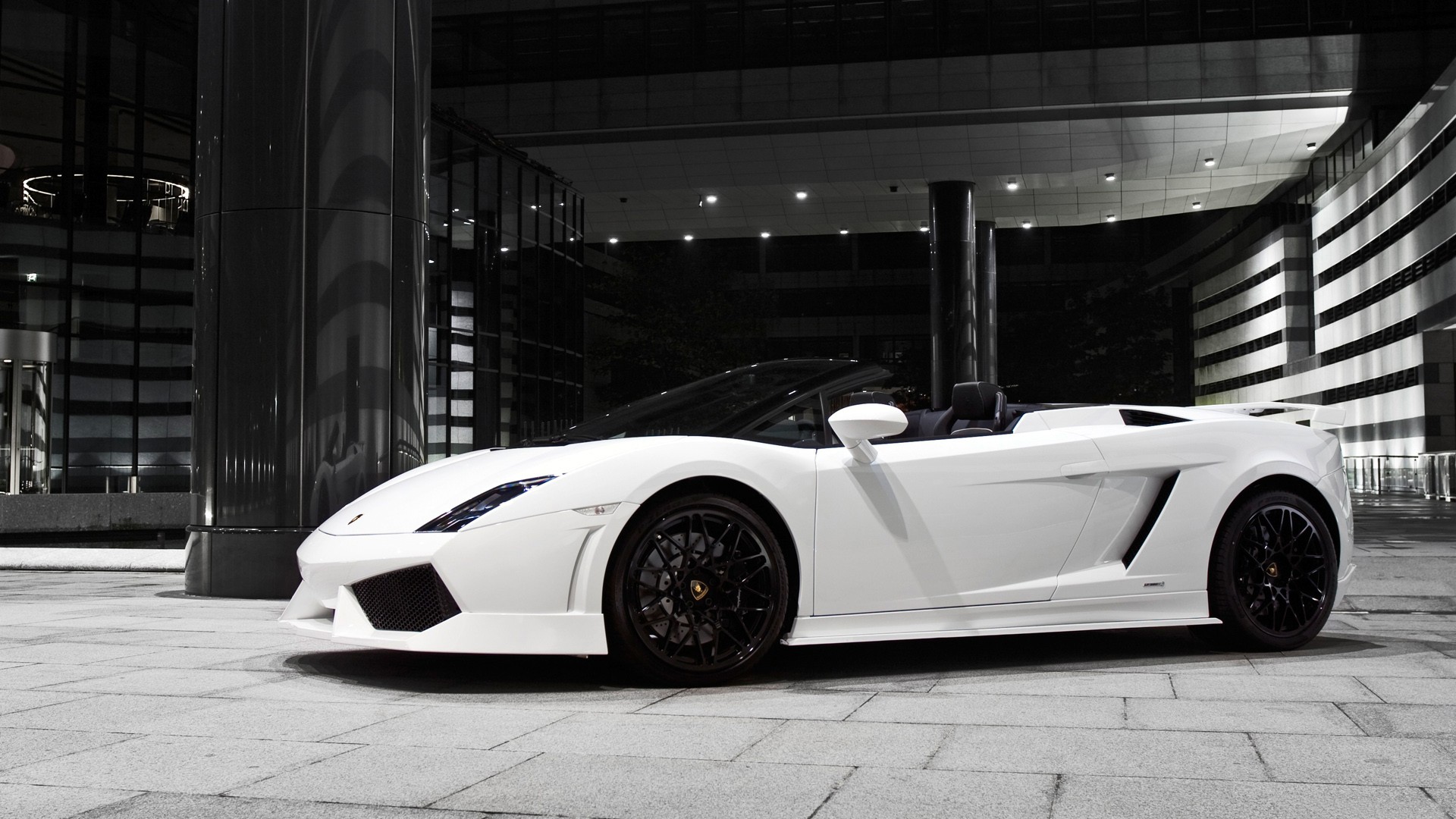 Description: A white sports car parked in a parking lot at night time with a black roof and a black leather seat.