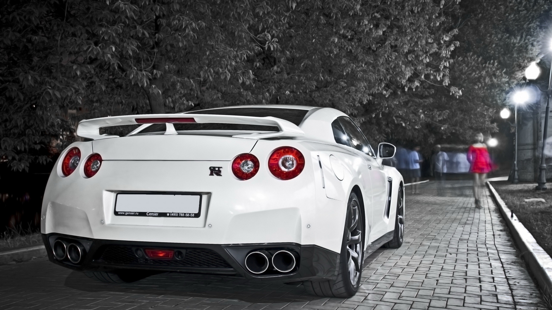 Description: A white sports car parked on a brick road at night with a person walking by it and a person in a red coat.