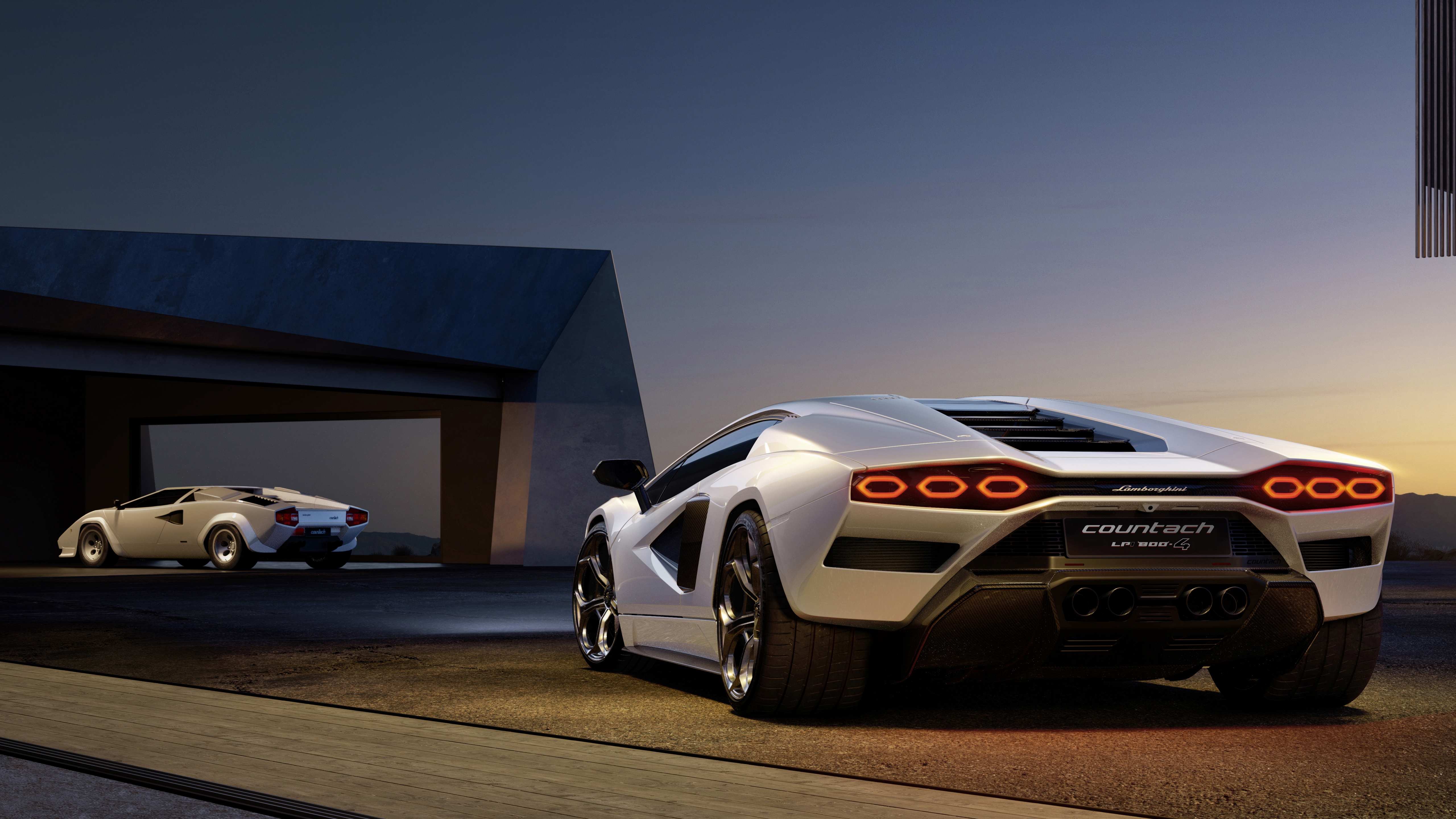 Description: A white sports car parked in front of a building at night with a white sports car in the background.