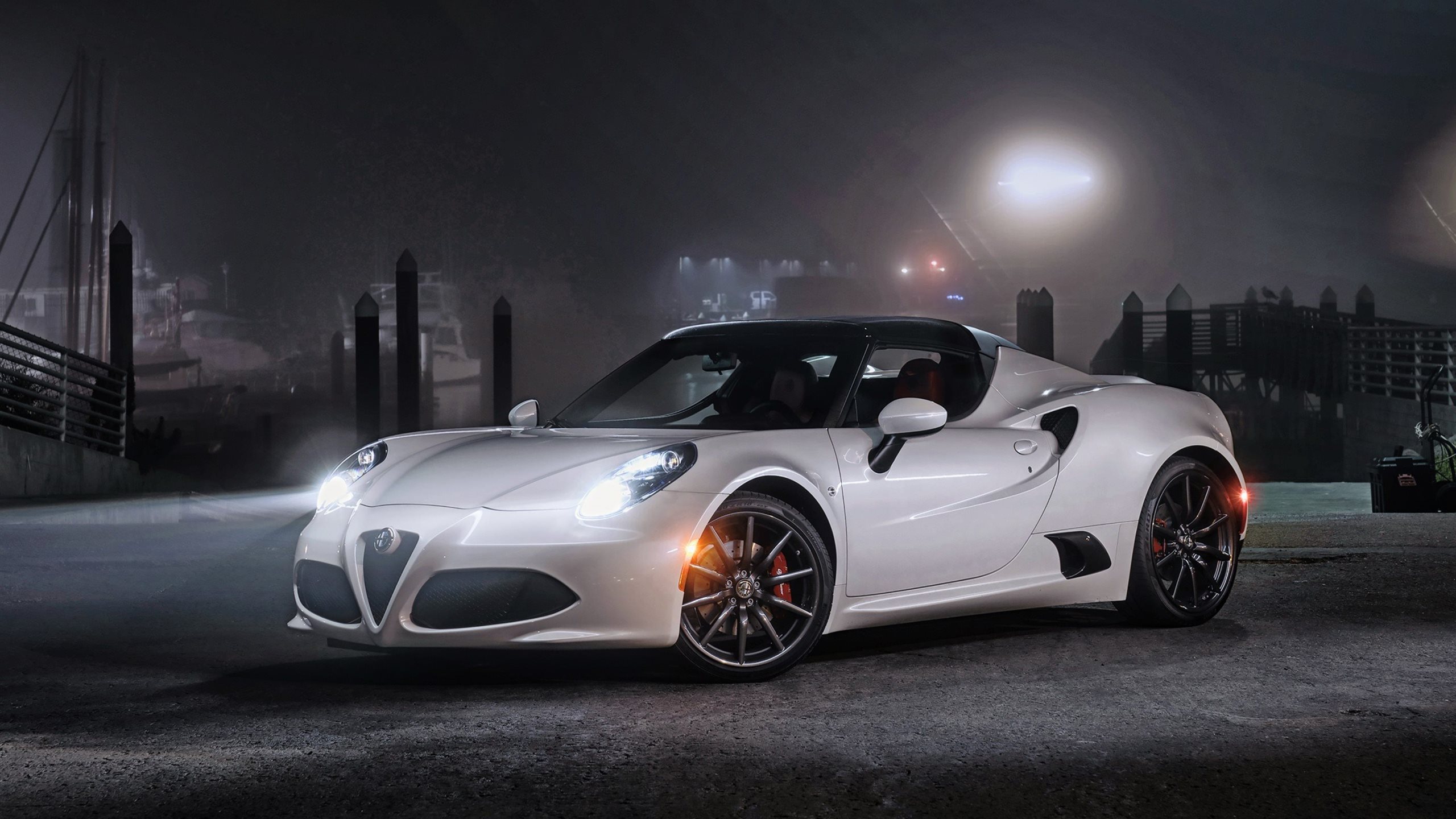 Description: A white sports car parked in a parking lot at night with a city in the background and fog in the air.